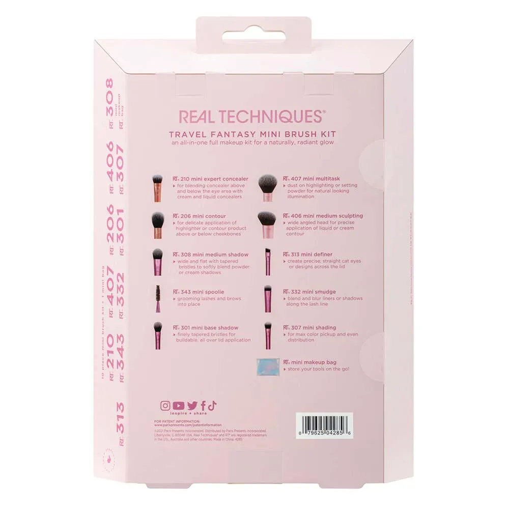 Maquie em qualquer lugar com o Kit de 10 pincéis Real Techniques + Bolsa Travel Fantasy; uma coleção de pincéis de tamanho de viagem que atendem a todas as suas necessidades de maquiagem, enquanto você está fora de casa.