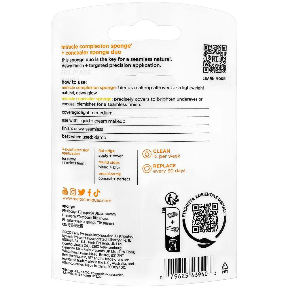O Real Techniques Miracle Complexion Sponge + Concealer Sponge Duo reúne o icônico MCS para uma base úmida e a Miracle Concealer Sponge para um acabamento iluminado