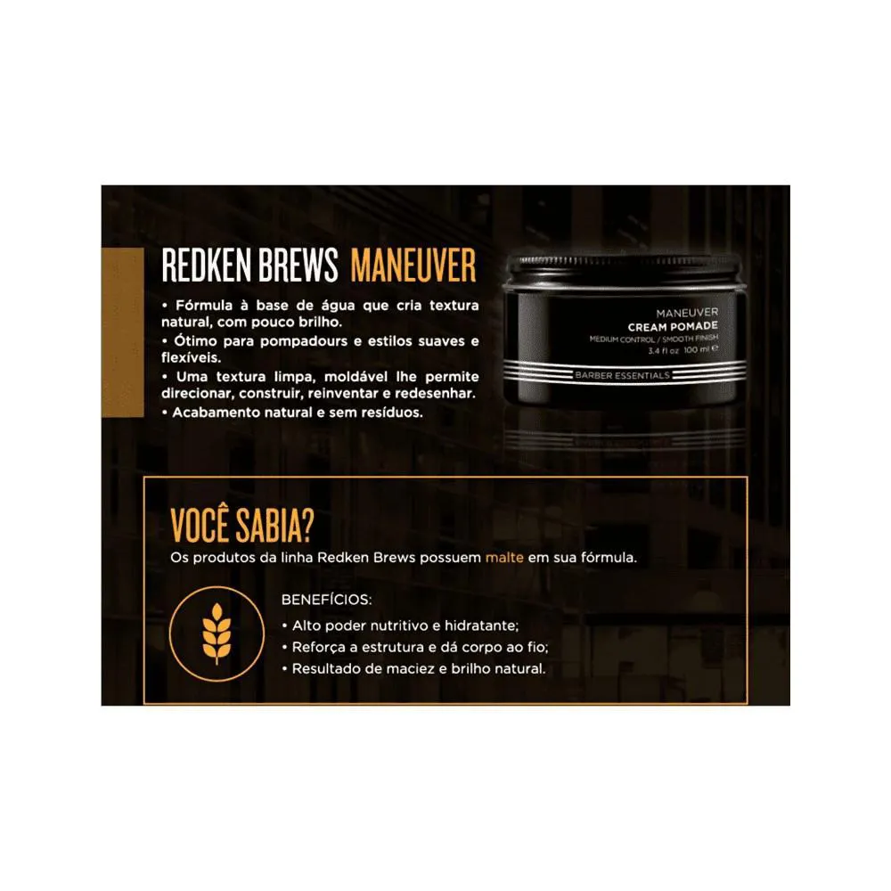 Redken Brews Maneuver - Creme Modelador 100ml Pomada em creme masculina com acabamento levemente brilhante. Redken Brews Maneuver Cream Pomade define seu estilo ao texturizar os fios com praticidade. Ele garante fixação média e flexibilidade na criação do visual. Redken Brews Maneuver Cream Pomade possui base em água de fácil remoção com shampoo. Assim, seu penteado fica ainda mais prático, bonito e suavizado, com aspecto próximo ao natural. Conselho de Aplicação: Esfregue uma pequena quantidade da pomada nas mãos e crie o penteado com os cabelos úmidos ou secos. Resultado: Seu visual ganha definição, textura e flexibilidade.