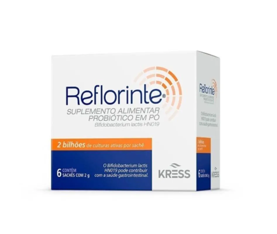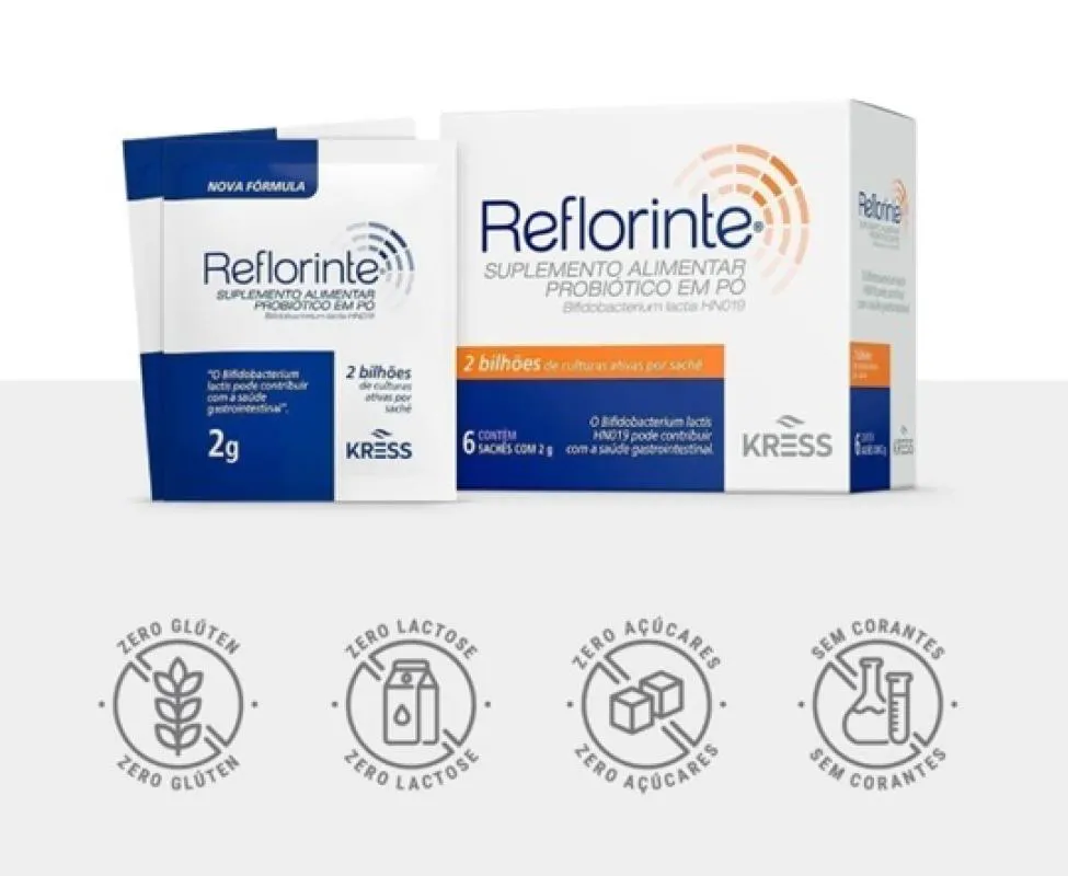 O Reflorinte é um suplemento alimentar probiótico em pó, composto por bactérias benéficas, especificamente Bifidobacterium lactis HN019, apresentado em 6 sachês de 2G cada. Cada sachê contém 2 bilhões de culturas ativas de probióticos. Serve para restaurar a flora intestinal, auxiliar no controle da diarreia e aliviar o desconforto abdominal, contribuindo para a saúde gastrointestinal.