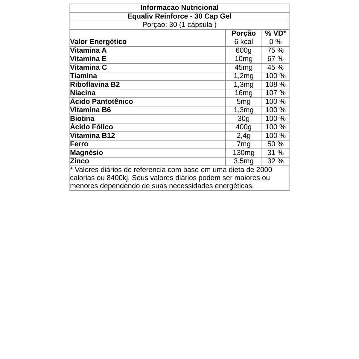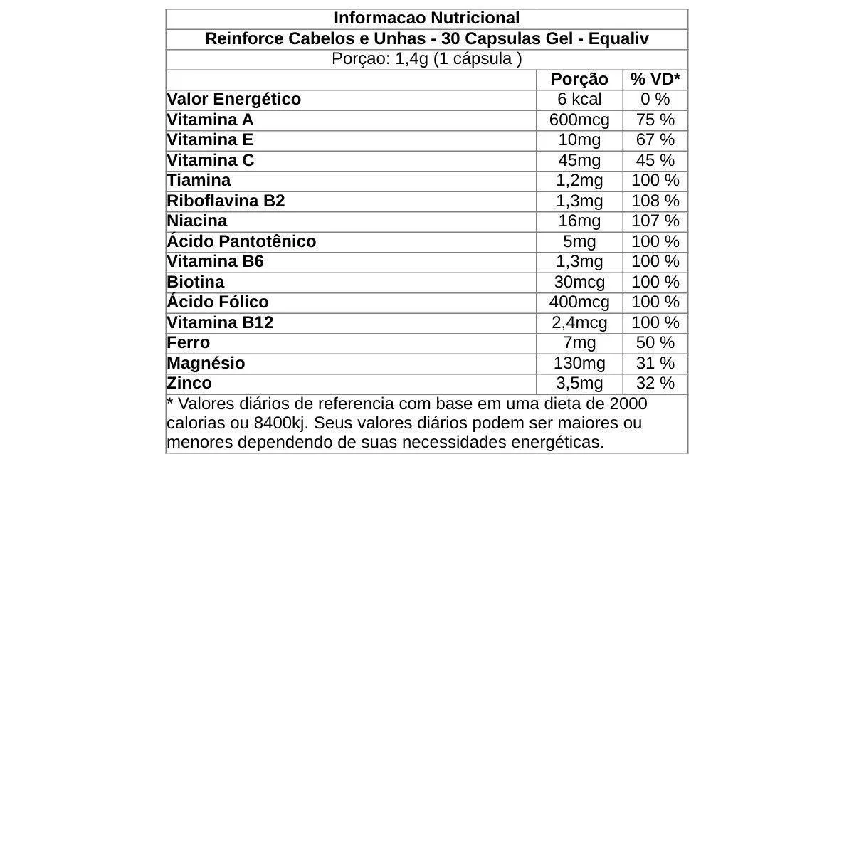 Equaliv Reinforce é um suplemento vitamínico-mineral completo, desenvolvido especialmente para promover a saúde, o fortalecimento e o crescimento dos cabelos e unhas. Sua fórmula avançada combina minerais quelatos com biotina e ácido pantotênico, além de vitaminas e minerais essenciais como A, C, E, complexo B, zinco, ferro e magnésio.