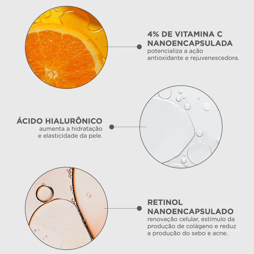 - Sérum com Vitamina C nanoencapsulada antioxidante.