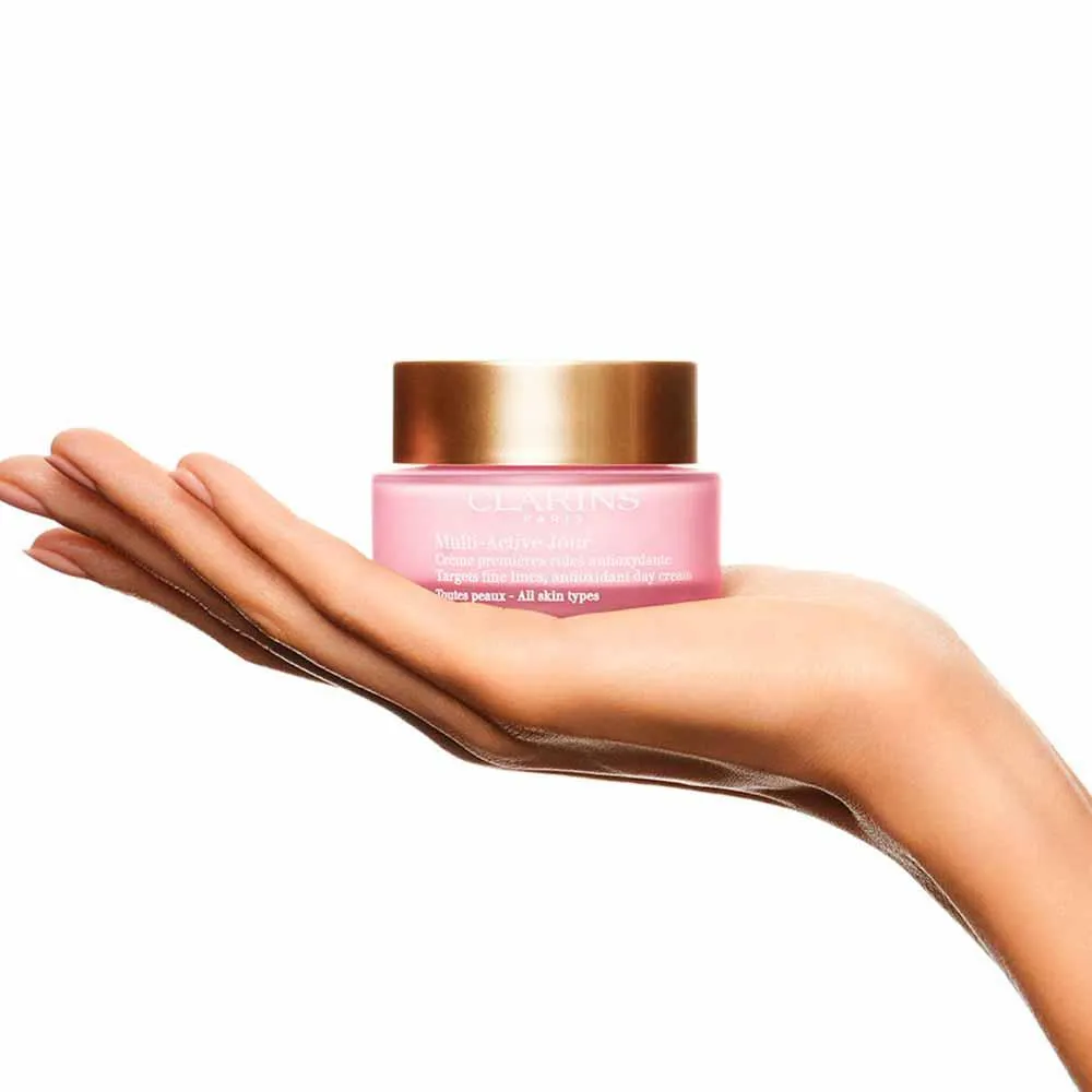 Dias acelerados, ritmos desenfreados... O stress e falta de sono ficam marcadas no seu rosto. Descubra o creme Multi-Active Jour Day, cuidado incansável imaginado para si! A sua tecnologia, inspirada nos últimos avanços científicos de Clarins, associada ao poder das plantas, atenua visivelmente as primeiras rugas, impulsiona a luminosidade, hidrata e prolonga a juventude do seu rosto. Hora após hora. Hoje e amanhã.