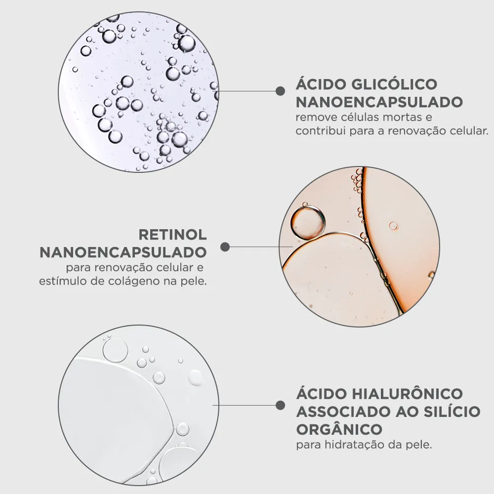 É um sérum facial ultraleve noturno, formulado com uma tríade exclusiva de ativos rejuvenescedores, composto por Ácido Glicólico, Retinol nanoencapsulado e Ácido Hialurônico associado ao silício orgânico. Serve para promover a renovação e rejuvenescimento da pele, reduzindo linhas finas e rugas de expressão, aumentando a renovação celular, estimulando a produção de colágeno e elastina, além de hidratar e melhorar a textura da pele para todos os tipos de pele.