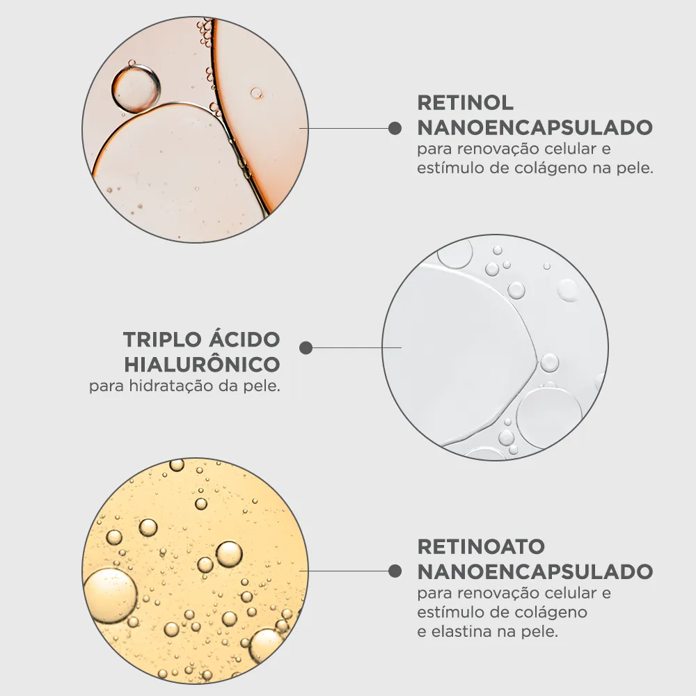 - Formulação potente com retinoato nanoencapsulado.