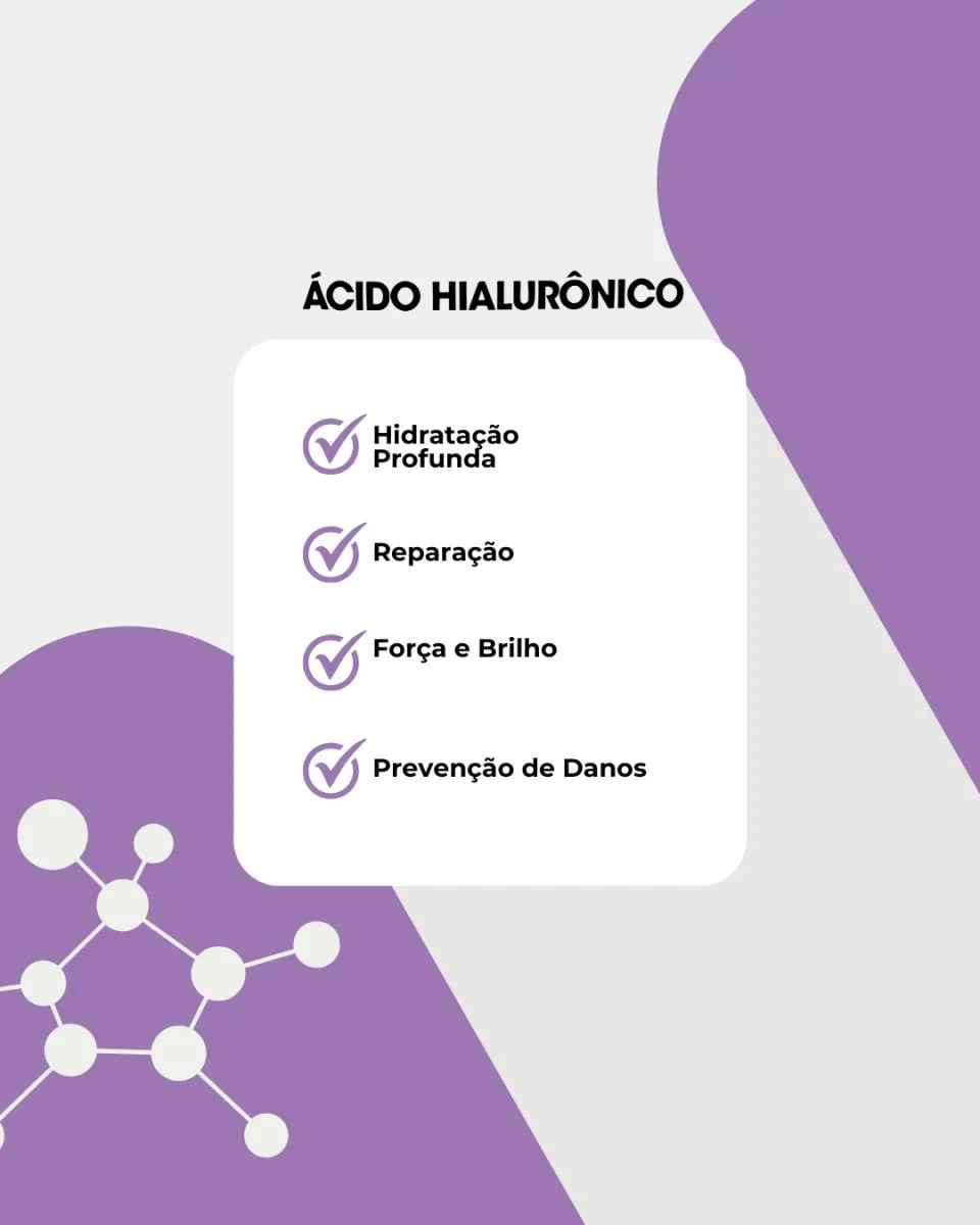 -Hidratação: O ácido hialurônico é um poderoso agente hidratante, que repõe a umidade dos fios ressecados.