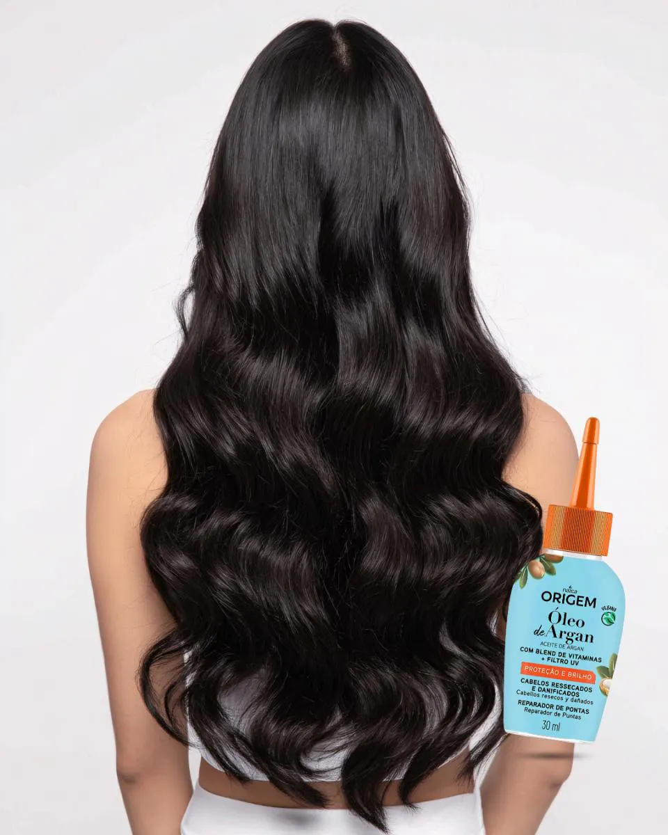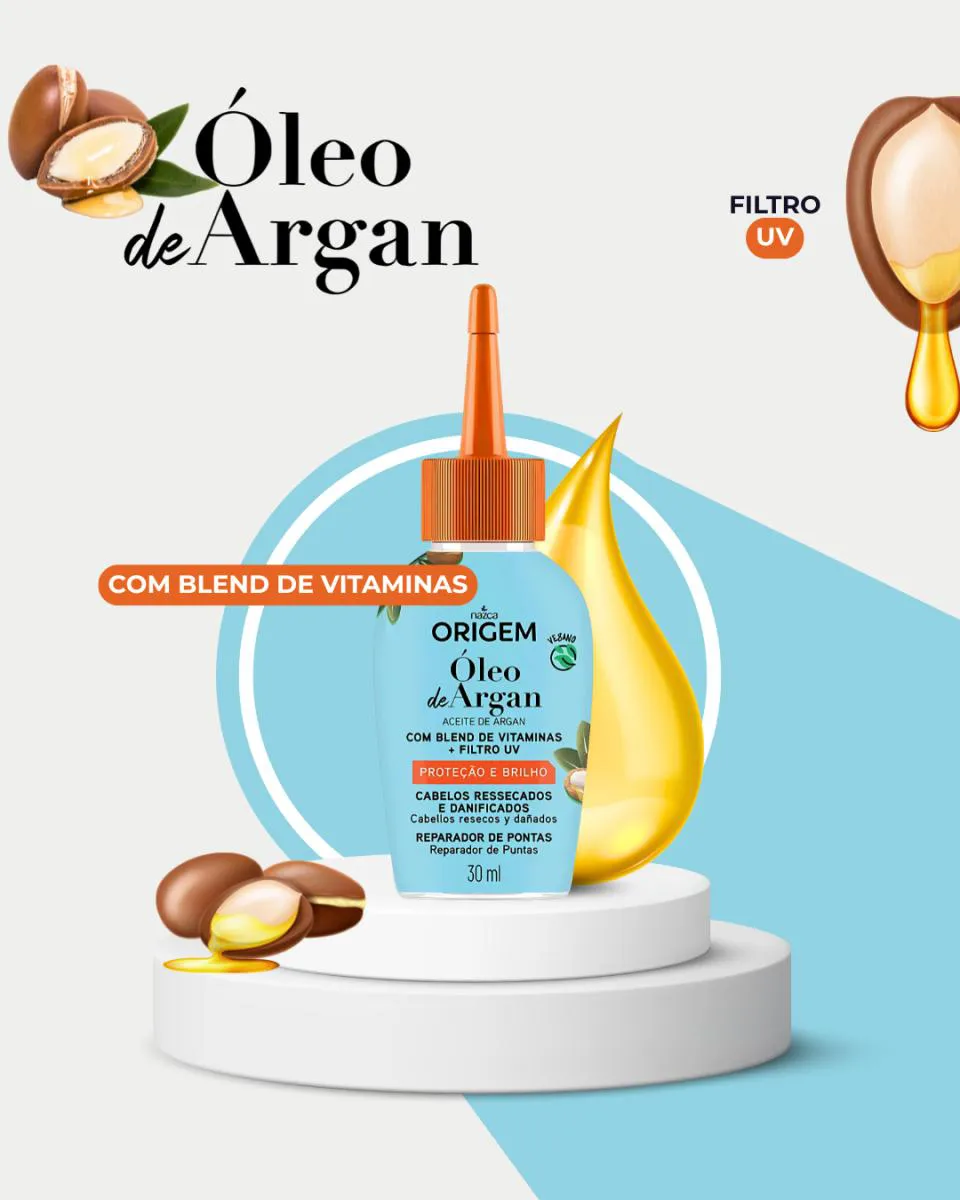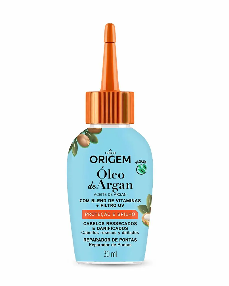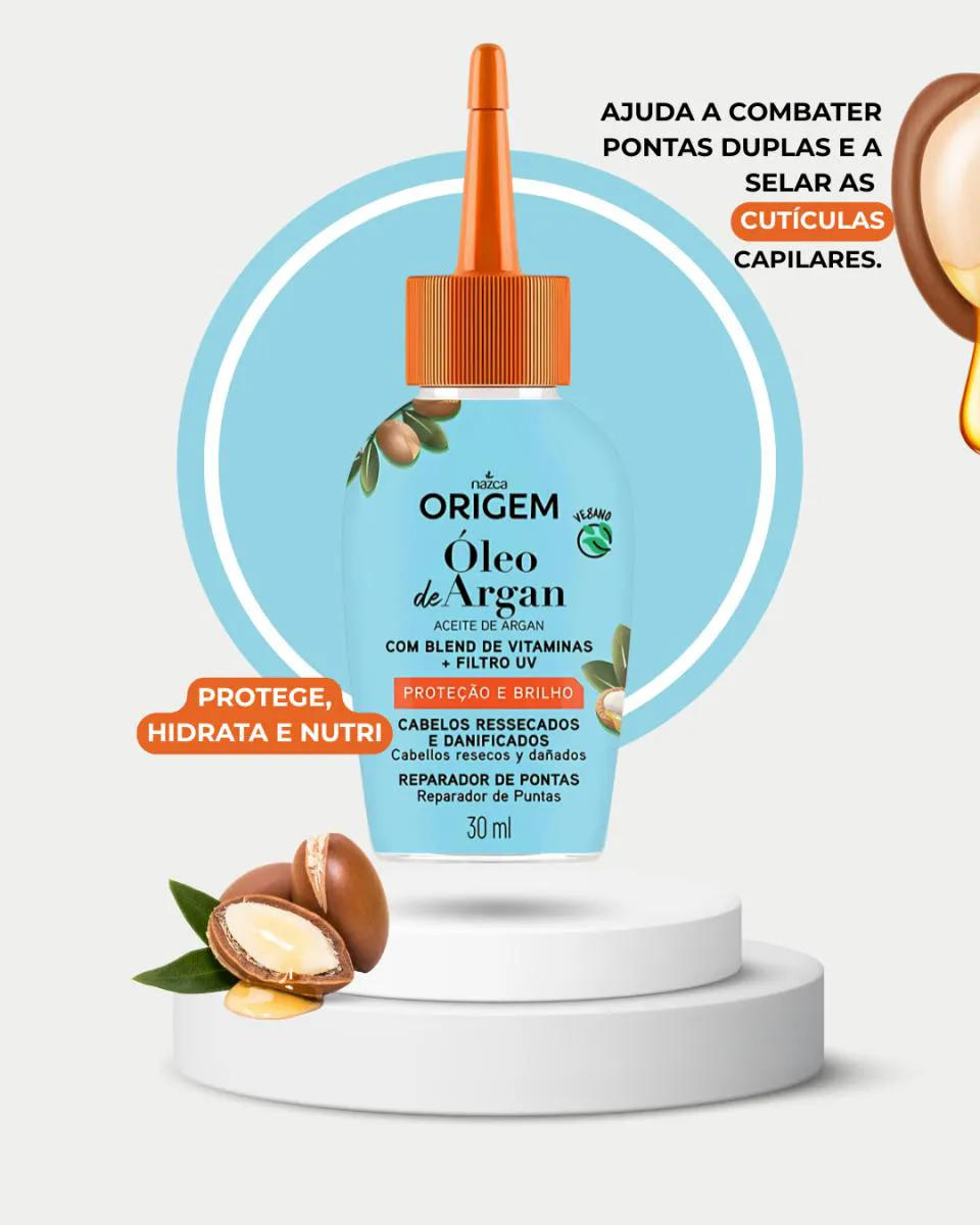 O Óleo Reparador de Pontas Nazca Origem Argan 30ml serve para nutrir, hidratar e proteger cabelos ressecados e danificados, combatendo as pontas duplas e o ressecamento. Rico em óleo de argan, o produto proporciona brilho, maciez e um aspecto mais saudável aos fios, além de oferecer proteção contra danos externos e o sol.