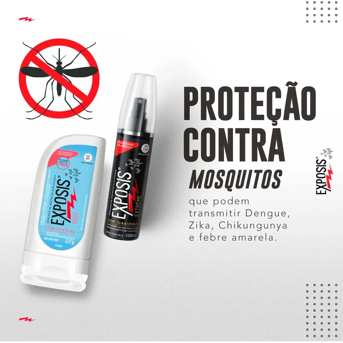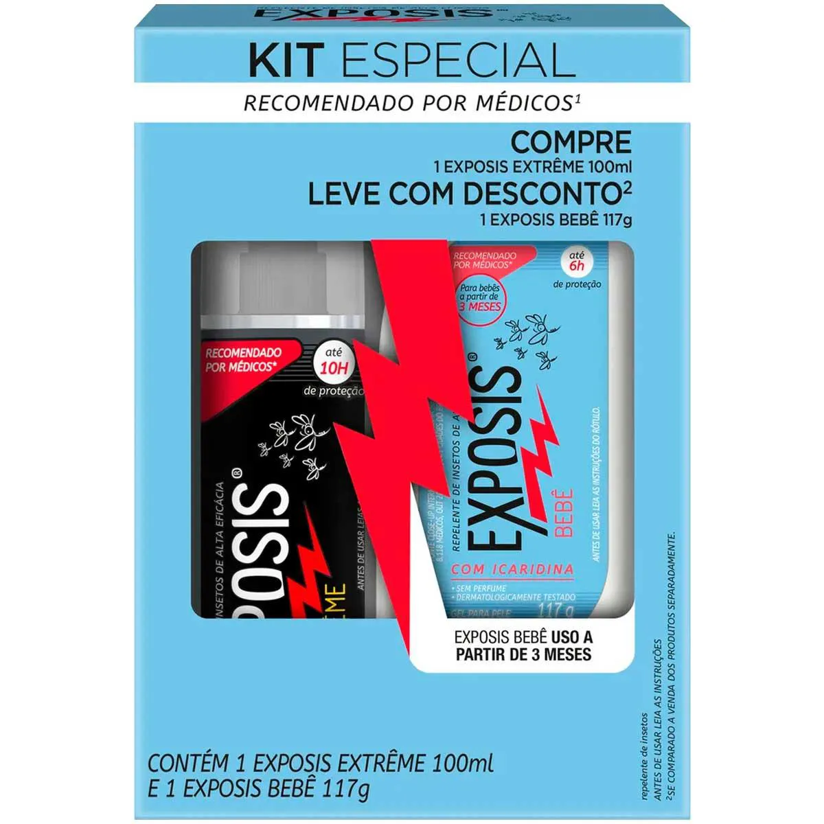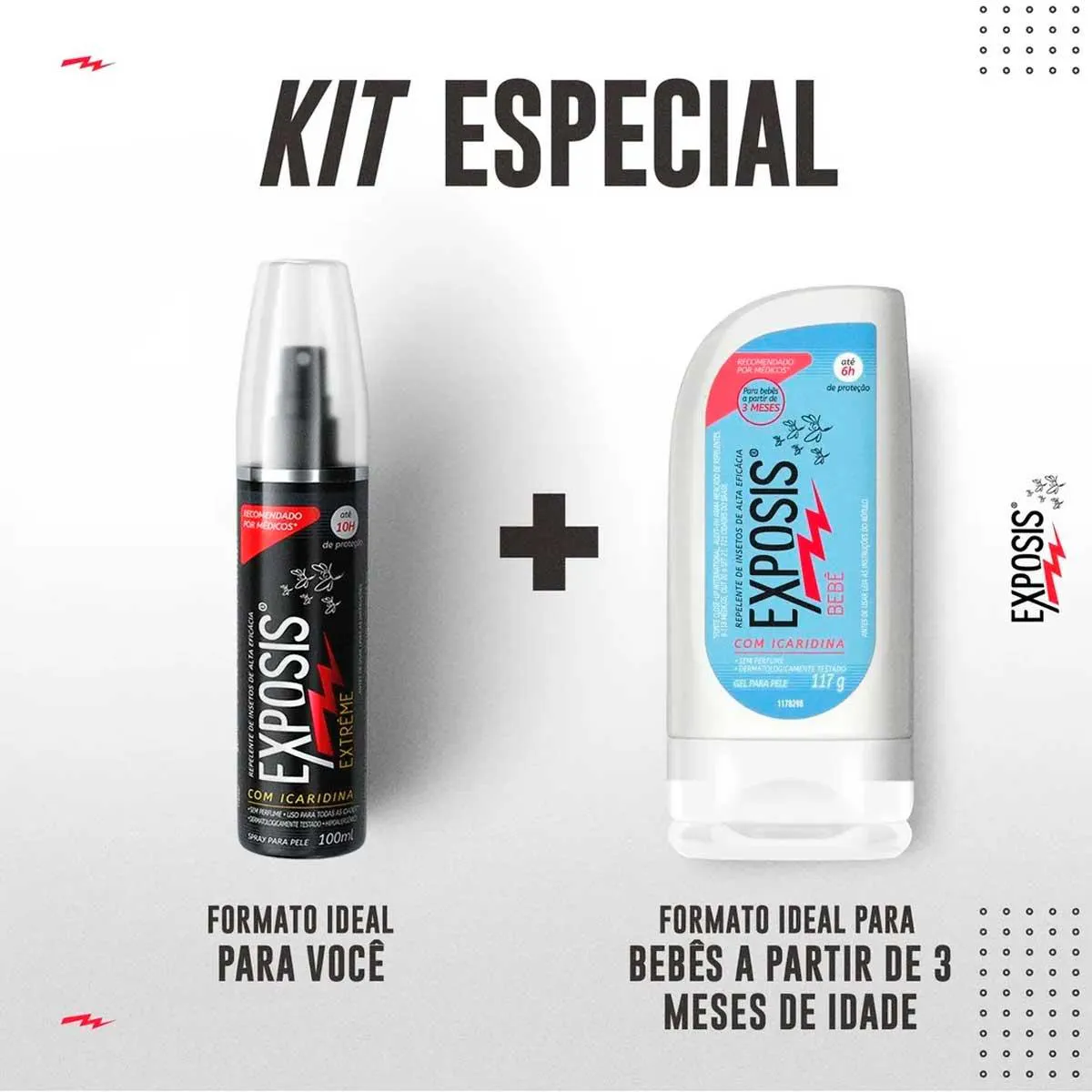 Proteja sua família com o Kit Repelente Exposis, que inclui o Repelente Spray Exposis Extreme 100ml e o Repelente Bebe Exposis Gel 117g, ambos com Icaridina para garantir máxima eficácia contra mosquitos e pernilongo causadores de incômodo. O repelente Exposis Extreme oferece proteção por até 10h e pode ser usado a partir de 6 meses de idade, enquanto o repelente baby protege por até 6h e pode ser usado a partir de 3 meses de idade. Dermatologicamente testados, sem cheiro e com fórmulas seguras para toda a família. Com o Kit Exposis Repelente você estará protegido contra mosquito e insetos que causam desconforto.