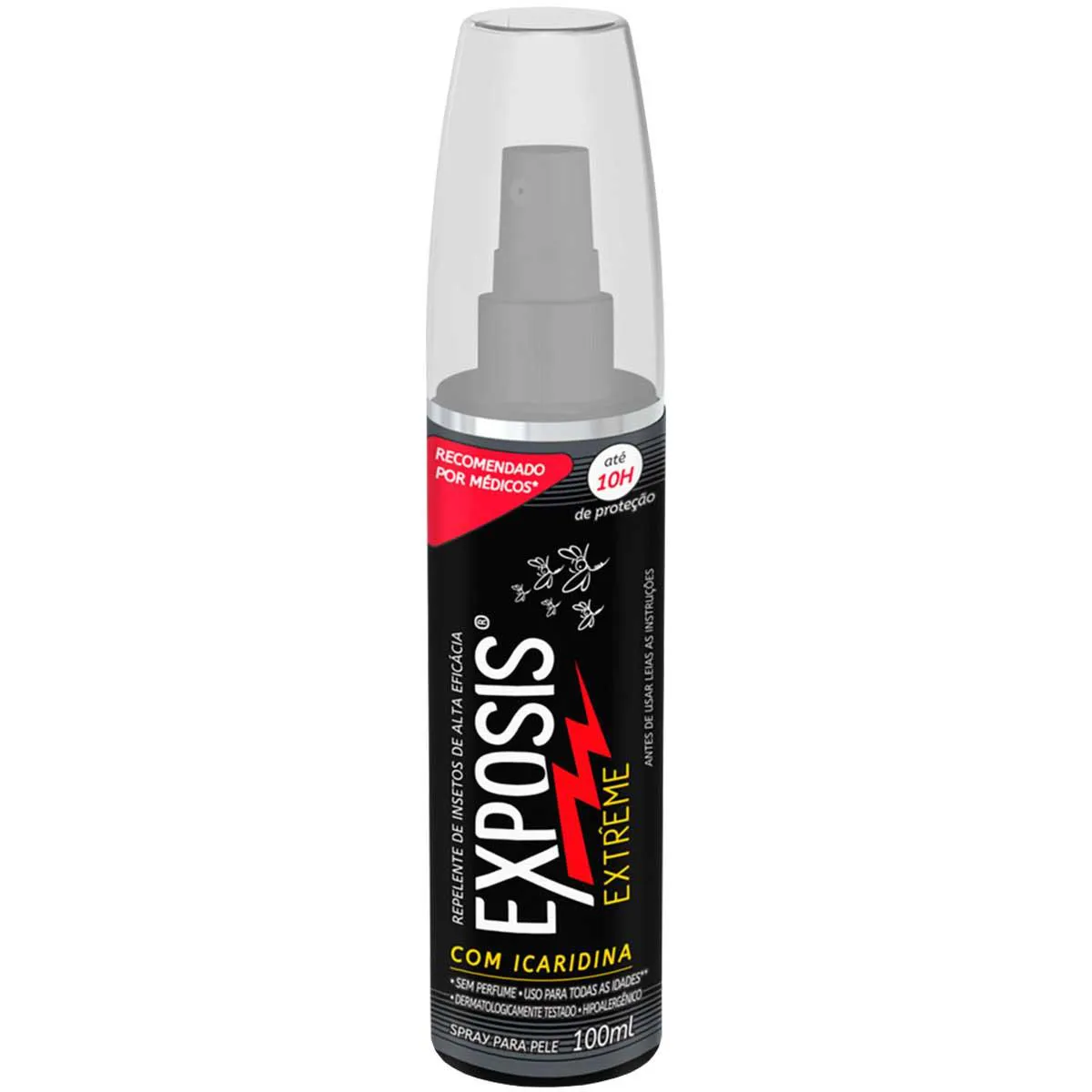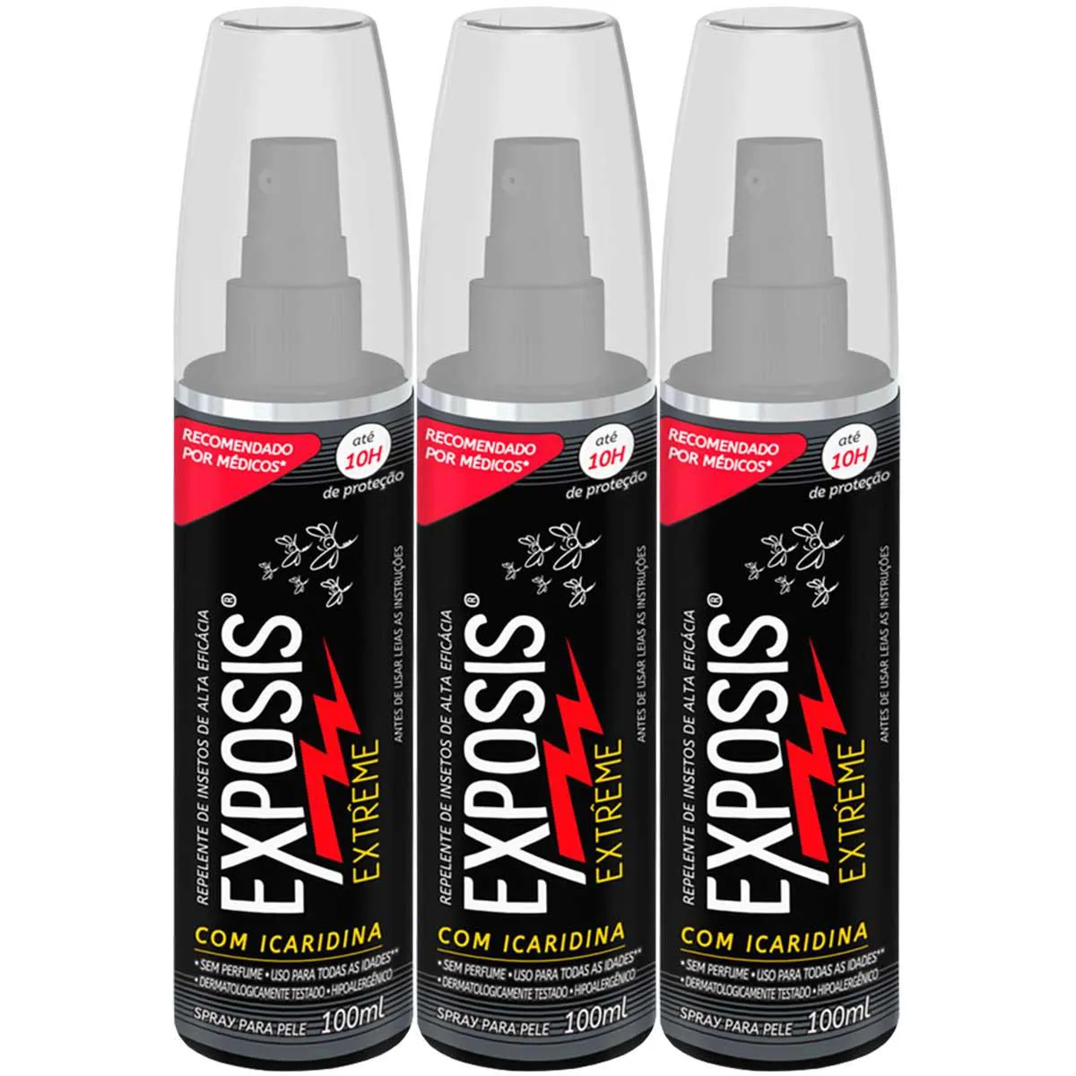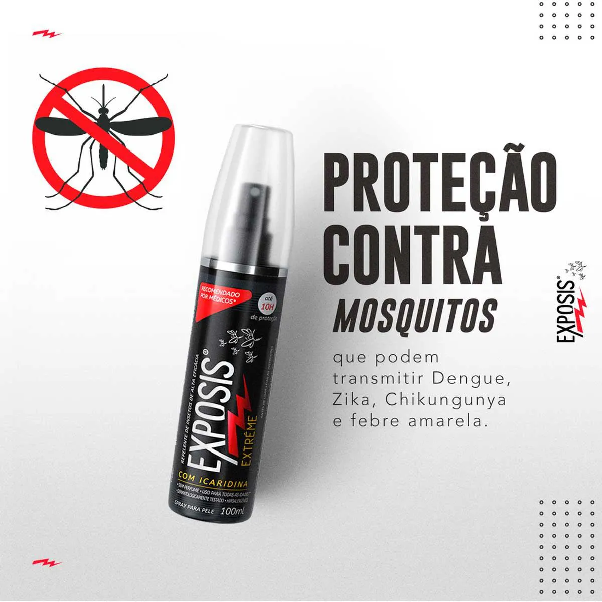 O Repelente Exposis Extrême é um spray repelente de insetos dermatologicamente testado e hipoalergênico, formulado com 25% de icaridina, desenvolvido para proteção contra insetos. Sua embalagem contém 03 unidades de 100 ml cada, sendo seguro para uso a partir dos 02 anos de idade.