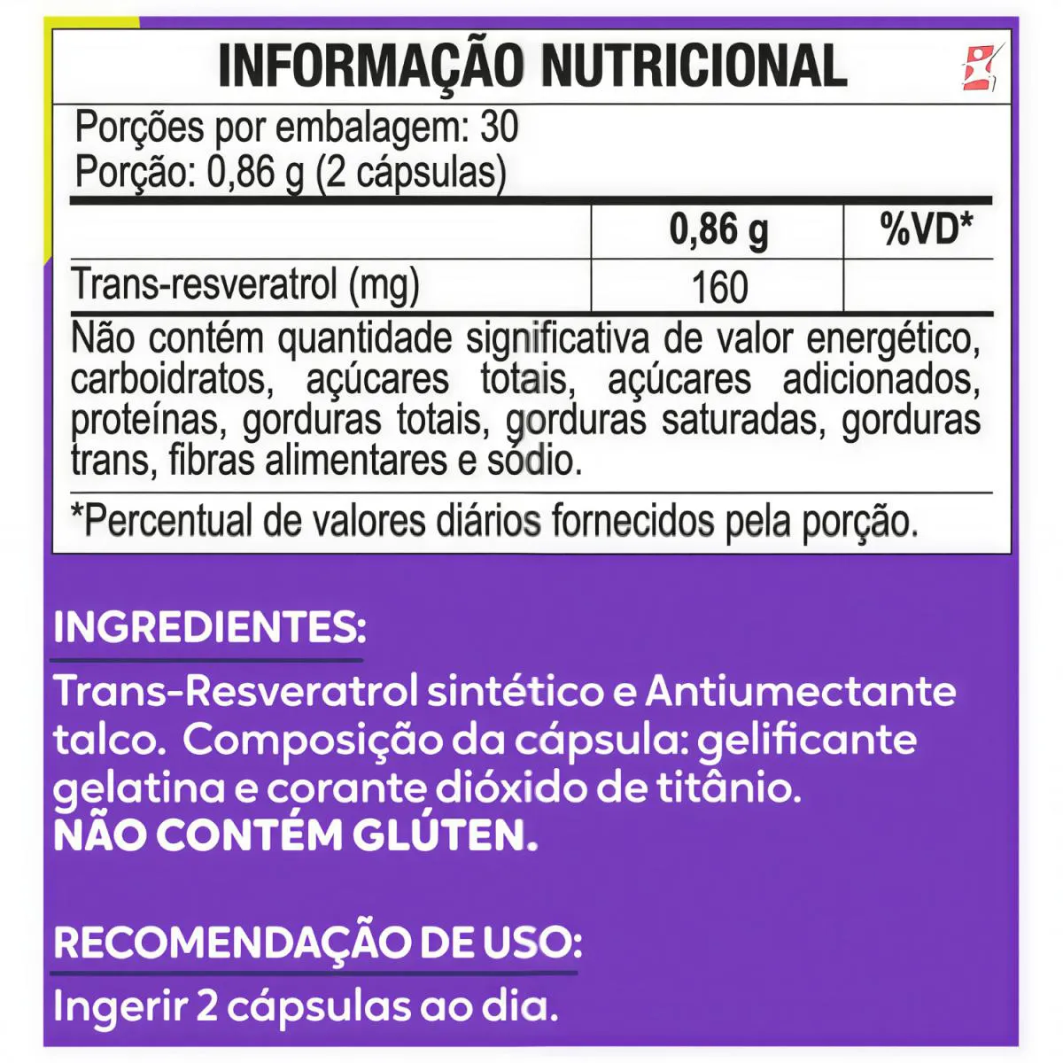 RESVERATROL 160MG TRANS-RESVERATROL 60 CÁPSULAS - MALTTA NUTRITION DESCRIÇÃO O resveratrol é um polifenol antioxidante potente encontrado no vinho tinto, uvas e amendoim, conhecido por poder auxiliar a combater o envelhecimento precoce, BENEFÍCIOS - Rende 30 doses/porções; - Apenas 2 cápsulas ao dia; - 1 porção = 160mg de resveratrol; - Ação antioxidante; - Saúde da pele; - Saúde do cérebro. RECOMENDAÇÃO DE USO Ingerir 2 cápsulas ao dia. INGREDIENTES Trans-resveratrol sintético e antiumectante talco. Composição da cápsula: gelificante gelatina e corante dióxido de titânio. NÃO CONTÉM GLÚTEN. DADOS TECNICOS Resveratrol. SUPLEMENTO ALIMENTAR EM CÁPSULAS. Contém 60 cápsulas. colorido Artificialmente. PRODUTO DESTINADO A PESSOAS ACIMA DE 19 ANOS. ESTE PRODUTO NÃO DEVE SER CONSUMIDO POR GESTANTE, LACTANTE E CRIANÇAS. ESTE PRODUTO NÃO PE UM MEDICAMENTO. NÃO EXCEDER A RECOMENDAÇÃO DIÁRIA DE CONSUMO INDICADO NA EMBALAGEM. MANTENHA FORA DO ALCANCE DE CRIANÇAS.