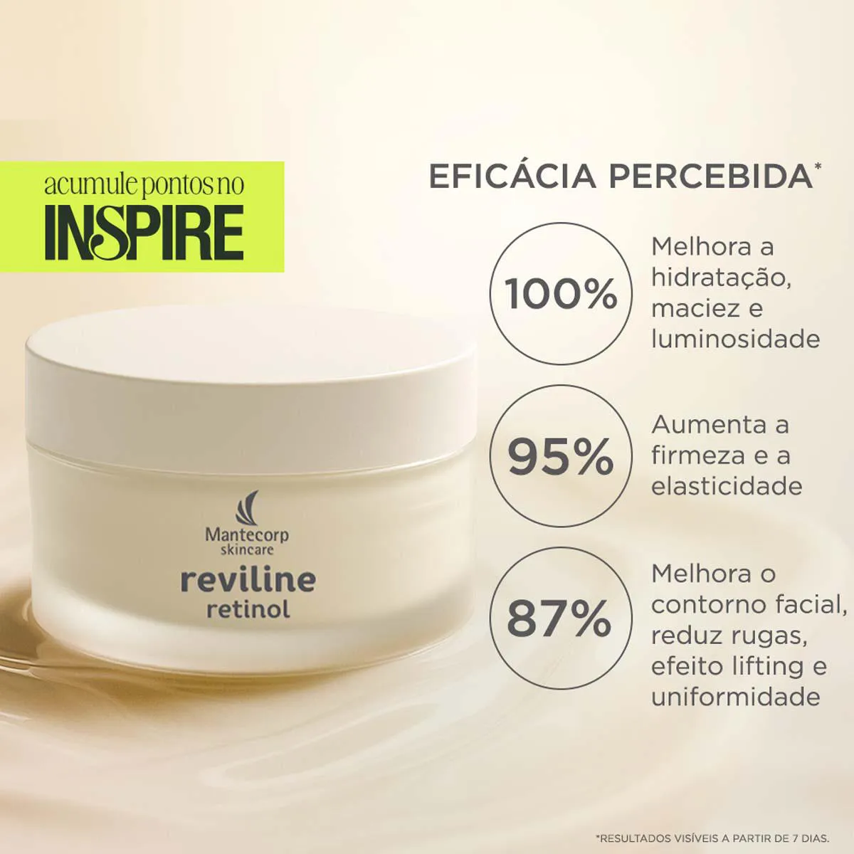 Reviline Retinol Creme é um rejuvenescedor nutritivo e hidratante desenvolvido para estimular a renovação celular da pele, aumentar a produção de colágeno e elastina, promovendo firmeza, suavização de linhas de expressão e textura mais homogênea.