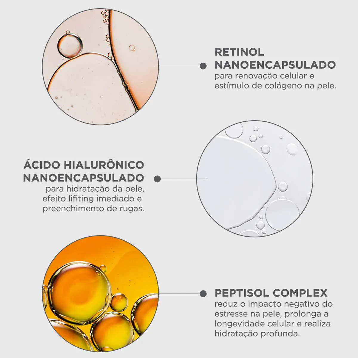 Retinol e Ácido Hialurônico Nanoencapsulados; Peptisol Complex (azepanyl + Peptídeo + Aminoácidos).