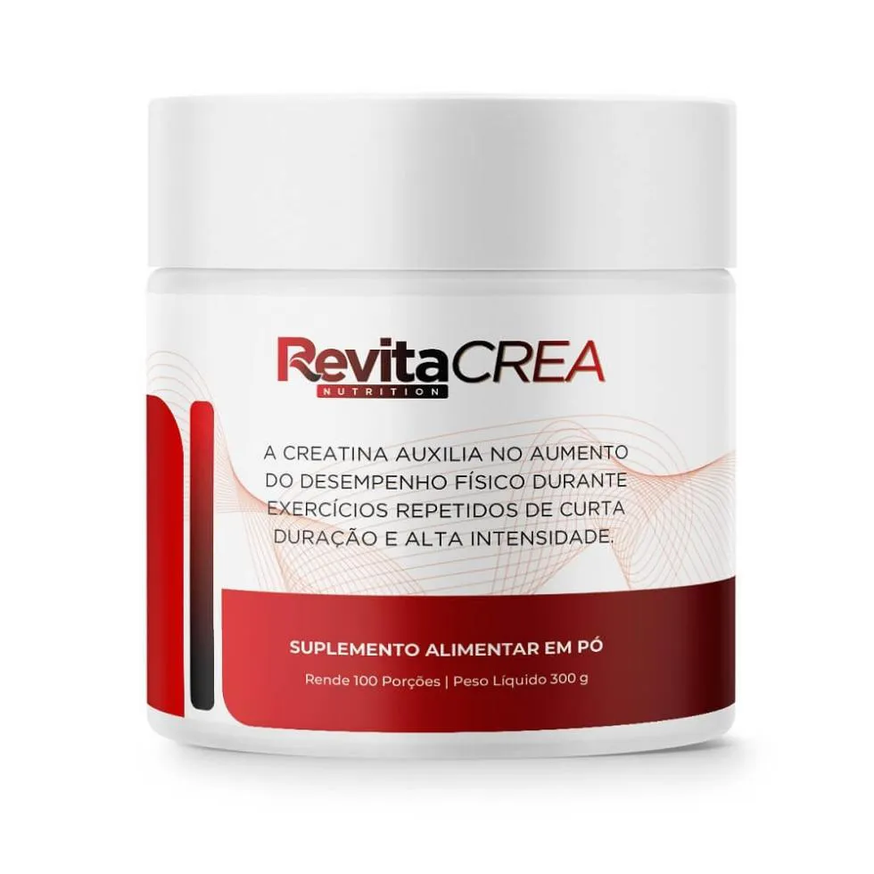 Revita Crea (300g) Revita CREA é um suplemento alimentar da Revita Nutrition, formulado para auxiliar na performance dos treinos, aumentando a força e contribuindo para o ganho de massa muscular. Com creatina monoidratada como ingrediente principal, Revita CREA também ajuda no combate à fadiga, melhora o metabolismo e as funções cognitivas. Ideal para quem busca otimizar seus resultados na academia e alcançar um desempenho físico superior. Benefícios: - Auxilia na performance dos treinos com o aumento da força - Contribui com o aumento da massa muscular - Auxilia no combate a fadiga, melhora do metabolismo e funções cognitivas