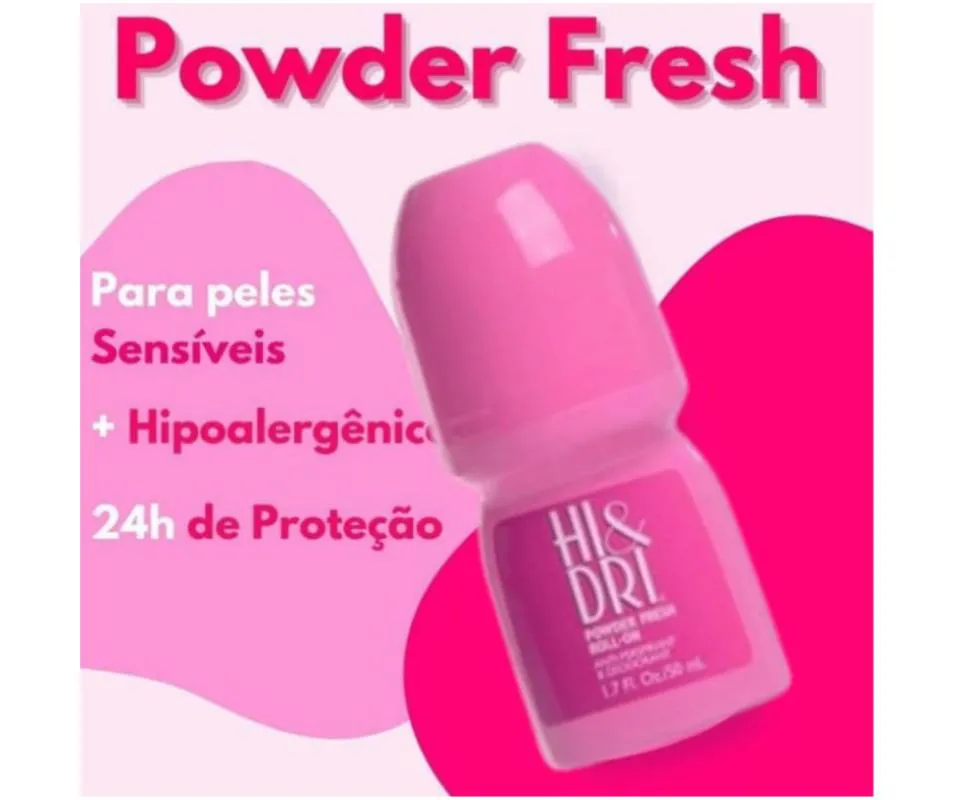 desodorante roll-on. Hi & Dri Powder Fresh evita o suor ao longo do dia, deixando uma fragrância fresca e suave nas axilas. Neutraliza os odores causados pela transpiração, deixando você mais seguro para suas atividades cotidianas, como reuniões de trabalho e passeios com a família. O Desodorante Roll-on Hi & Dri Powder Fresh possui uma embalagem compacta e prática, perfeita para transportar na bolsa, mochila ou mala de viagens. É de fácil aplicação, e se espalha uniformemente pela pele, protegendo você para um dia tranquilo e seguro.