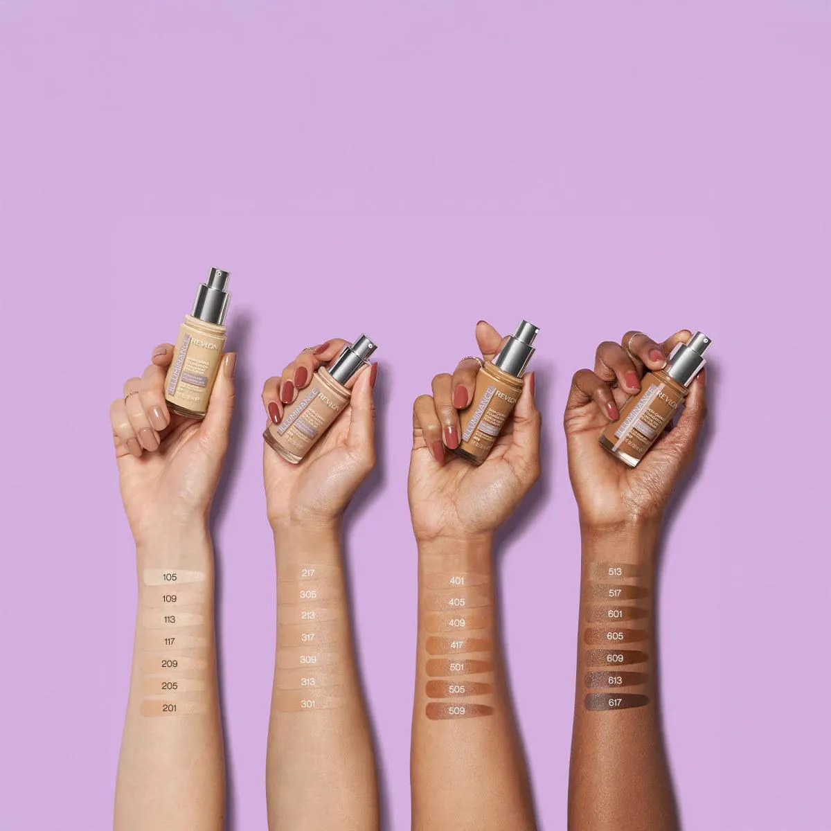 Revlon Illuminance Skin Caring Foundation - Pele Radiante com Cuidado Diário Proporciona uma pele radiante, uniforme e bem cuidada. Com 5% de esqualano, ácido hialurônico e antioxidantes botânicos, hidrata profundamente, suaviza linhas finas e melhora a textura em até 4 semanas. Sua cobertura média com acabamento luminoso garante um visual natural e saudável.