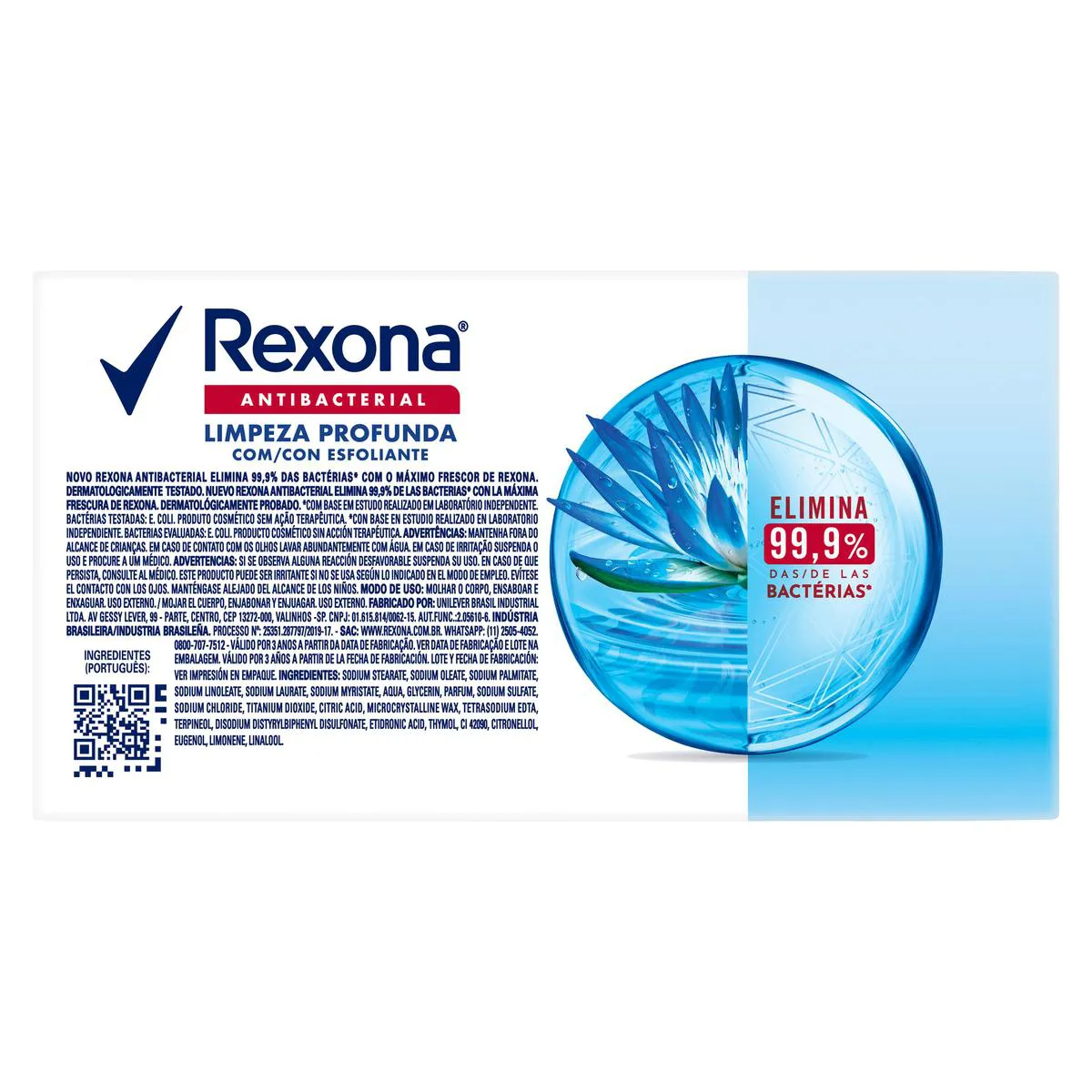 Modo de usar: Aplique o Sabonete Rexona Antibacteriano Antibacterial Limpeza Profunda sobre a pele umedecida e massageie suavemente fazendo espuma. Em seguida, enxágue abundantemente.
