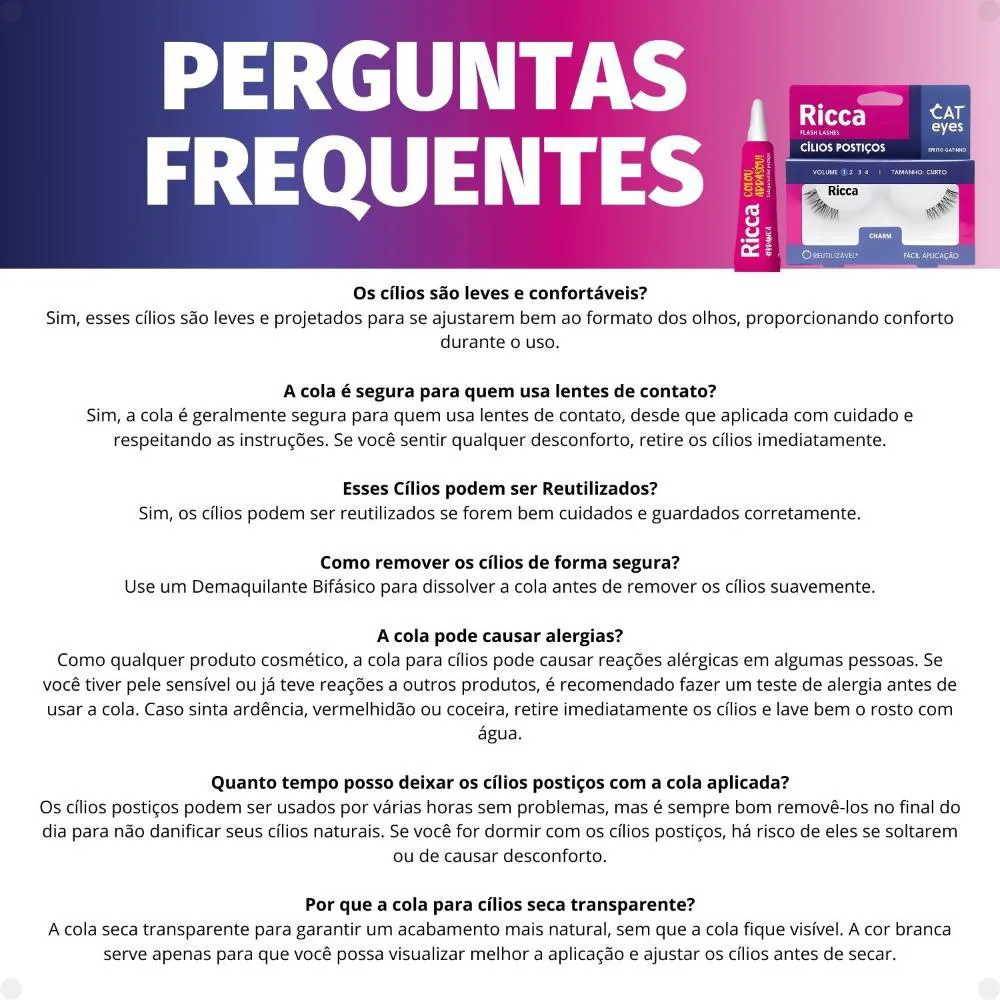 Contém: - 01 Par de Cílios Postiços Ricca Belliz Cat Eyes Charm Vol:1 Curto Cód.2699 - 01 Cola para Cílios Branca 7g. . Cílios Postiços Ricca Belliz Cat Eyes Charm Vol:1 Curto Cód.2699:Olhar ainda mais lindo! IdeaL para quem busca um olhar mais intenso e alongado, sem perder a naturalidade. A linha Cat Eyes tem esse efeito de "olhos de gato", proporcionando um acabamento mais dramático no canto externo dos olhos. Como eles são curtos, o visual fica mais sutil, perfeito para quem deseja um toque de volume sem exagerar. Os cílios são feitos com fios sintéticos de alta qualidade, o que proporciona um efeito natural, mas com muito mais intensidade em relação aos cílios naturais. . Modo de Uso: Comece aplicando uma camada de máscara para cílios, isso vai ajudar a dar base e fazer com que os cílios postiços se misturem melhor com os naturais. Destaque os Cílios da embalagem. Aplique cola de cílios na tira dos cílios e espere de 30 á 60 segundos até que fique pegajoso, aplique o Cílios Postiços rente aos cílios naturais e segure até colar totalmente. Para retirar utilize Demaquilante Bifásico e algodão, passe o demaquilante suavemente na linha dos cílios e descole-os começando pelo canto externo dos olhos. . Composição: Fios Sintéticos de Polibutileno Tereftalato e Nylon. . Cola para Cílios Branca: Essencial pra você colar seus cílios com segurança e um acabamento perfeito. A cola é branca mas fica transparente após a secagem deixando o acabamento ainda mais bacana, a duração é de 16 horas e você pode reaplicar caso necessário. . Modo de Uso: Para retirar utilize Demaquilante Bifásico e algodão, passe o demaquilante suavemente na linha dos cílios e descole-os começando pelo canto externo dos olhos. . Composição: Aqua, Rubber Latex, Acrylates Copolymer, Propylene Glycol, Cellulose GUM, Phenoxyethanol, Alcohol, Parfum (Benxyl Salicylate, Hexyl Cinnamal, Linalool, Limonene, Geraniol, Ammonium Hydroxide, Ethylhexylglycerin, Sodium Dehydoracetate, Isopropyl Alcohol. . Perguntas Frequentes: Os cílios são leves e confortáveis? Sim, esses cílios são leves e projetados para se ajustarem bem ao formato dos olhos, proporcionando conforto durante o uso. A cola é segura para quem usa lentes de contato? Sim, a cola é geralmente segura para quem usa lentes de contato, desde que aplicada com cuidado e respeitando as instruções. Se você sentir qualquer desconforto, retire os cílios imediatamente. Esses Cílios podem ser Reutilizados Sim, os cílios podem ser reutilizados se forem bem cuidados e guardados corretamente. A cola pode causar alergias? Como qualquer produto cosmético, a cola para cílios pode causar reações alérgicas em algumas pessoas. Se você tiver pele sensível ou já teve reações a outros produtos, é recomendado fazer um teste de alergia antes de usar a cola. Caso sinta ardência, vermelhidão ou coceira, retire imediatamente os cílios e lave bem o rosto com água. Quanto tempo posso deixar os cílios postiços com a cola aplicada? Os cílios postiços podem ser usados por várias horas sem problemas, mas é sempre bom removê-los no final do dia para não danificar seus cílios naturais. Se você for dormir com os cílios postiços, há risco de eles se soltarem ou de causar desconforto. Por que a cola para cílios seca transparente? A cola seca transparente para garantir um acabamento mais natural, sem que a cola fique visível. A cor branca serve apenas para que você possa visualizar melhor a aplicação e ajustar os cílios antes de secar. . Código de Registro Sanitário (ANVISA) Cola para Cílios Branca 7g: 25351.803018/2021-40 .