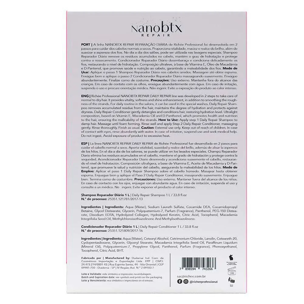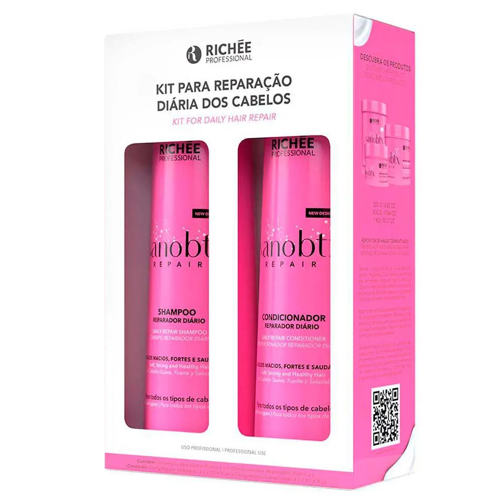 O kit Richée Professional Nanobtx Repair é uma linha de produtos capilares desenvolvida para cuidar de cabelos normais a secos, composto por um shampoo e um condicionador reparadores diários.