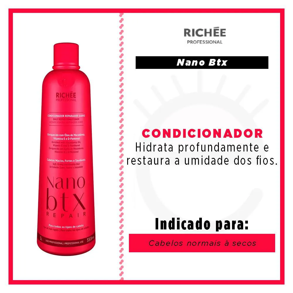 A linha Nano Btx Repair de Richée Professional é um processo inovador que devolve a massa perdida e a queratina dos cabelos fragilizados. Sua fórmula concentrada age de maneira eficaz em toda a estrutura capilar proporcionado restauração e reconstrução gradativa, aumento da resistência do fio, brilho intenso e redução do volume.