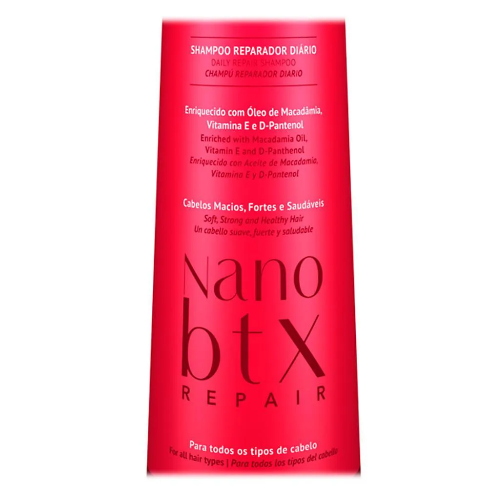 Cuida profundamente, proporcionando muito brilho, maciez e hidratação. Deixando os cabelos leves e com movimento, sem pesar. Tenha seus cabelos macios, fortes e saudáveis com o shampoo Reparador Diário Nano Btx.