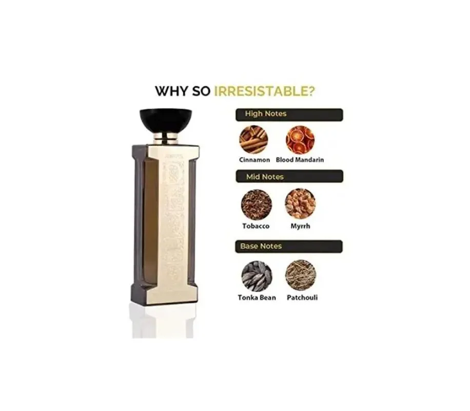 Com seu solo de patchouli, que mostra um tom terroso seco e empoeirado, no qual acompanha uma linha herbal quente e picante, mostrando a canela junto com a baunilha, indo para um grupo de acorde atalcado.