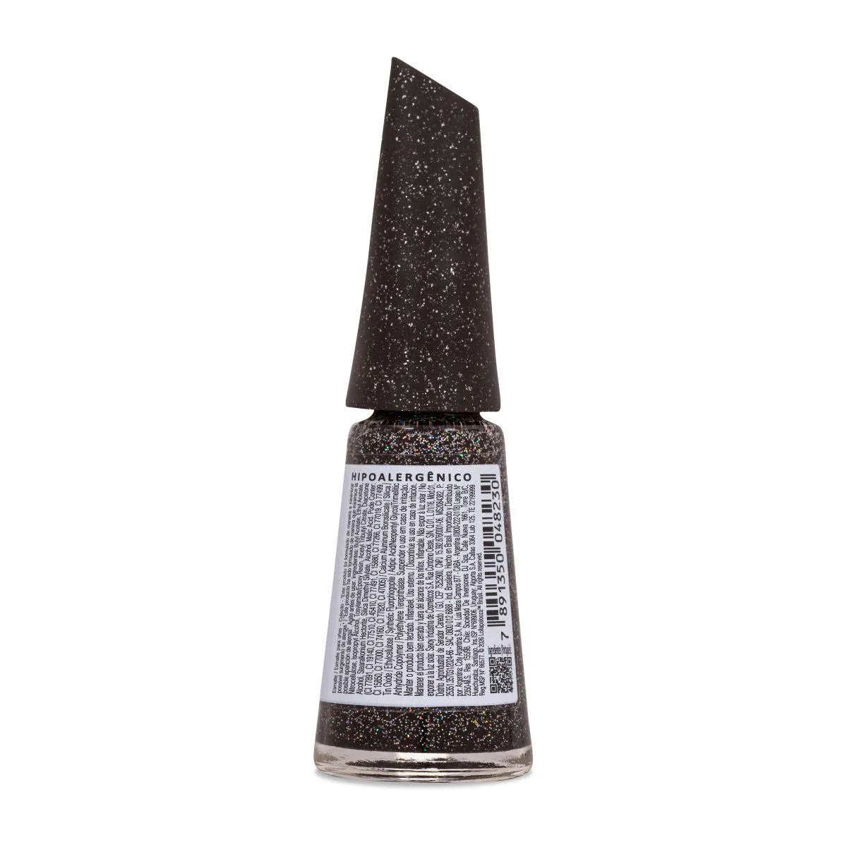 - Esmalte preto com glitter holográfico e efeito impactante.