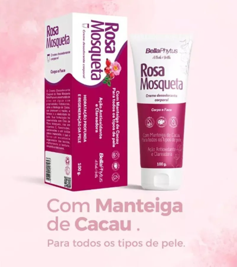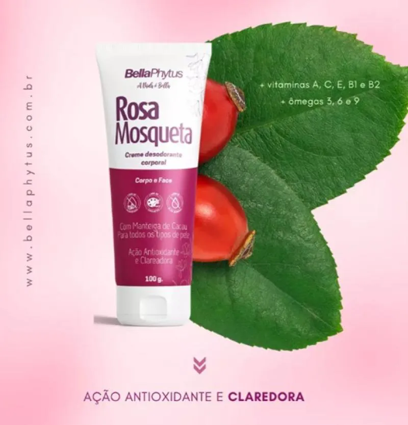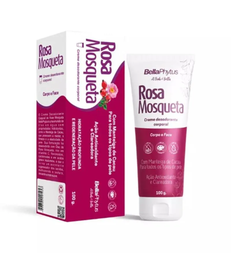 O Creme Desodorante Corporal de Rosa Mosqueta BellaPhytus é uma emulsão de óleo em água com propriedades hidratantes, que promovem a maciez, a firmeza e a elasticidade da pele. Sua formulação foi desenvolvida com Óleo de Rosa Mosqueta, rico em vitamina c, flavonoides, carotenoides e em ácidos graxos insaturados, o que o torna um excelente regenerador dos tecidos e antioxidante, melhorando a textura e reduzindo manchas.