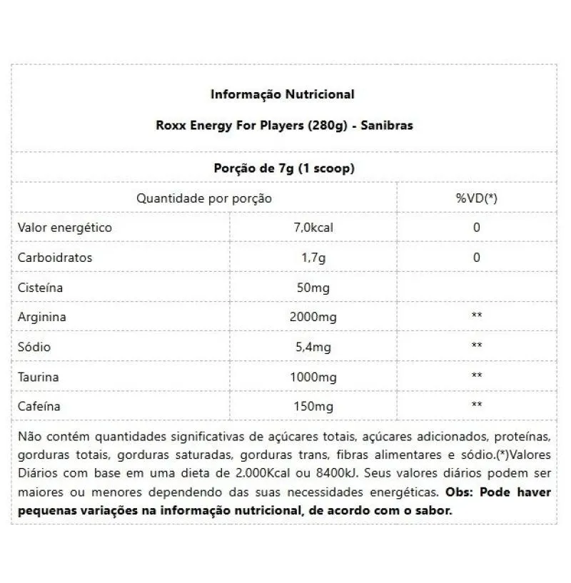 Roxx Energy (280g) ROXX Energy é um energético em pó com foco em pessoas que procuram mais sabor quando precisam de mais energia e estímulo para detonar em qualquer atividade. Nossa linha com deliciosos sabores já é a bebida energética oficial da maioria dos GAMERS da atualidade, pois nossa proposta é inovadora, tanto no sabor quanto na sua fórmula, exclusiva e altamente concentrada. Nossas fórmulas não contêm adição de açúcar, são de baixa caloria e contém somente ingredientes saudáveis, garantindo um energético de qualidade superior, que você pode utilizar a qualquer momento do seu dia, a toda hora que precisar de mais energia disponível. As fórmulas dos energéticos ROXX Energy são fabricadas pela Sanibras medicamentos e Nutrição, companhia brasileira com foco em saúde e 30 anos de experiência. ROXX Energy é formulado seguindo todos os protocolos de Certificação Internacional de Qualidade ISO 9001. Toda essa bagagem e experiência garantem processos de fabricação totalmente transparentes e com a utilização de ingredientes de altíssima qualidade. Cada pote de ROXX Energy contém 40 doses altamente concentradas. Cada dose diluída em 300ml de água contém uma carga de combustível completa para recarregar suas energias de forma segura e saudável. Veja como nossa fórmula é diferente: Benefícios: - 2g de Arginina; - 150mg de Cafeína; - 1g de L-Taurina; - Low Carb (Baixo Carboidrato); - Zero Sódio; - Zero Glúten; - Zero Lactose.