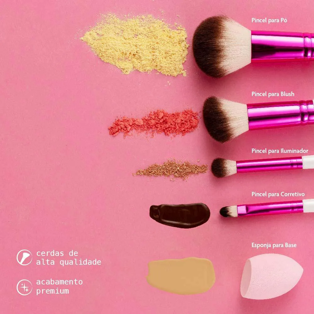 Utilize os pincéis do kit para aplicação de pó, blush, corretivo, base e iluminadores.