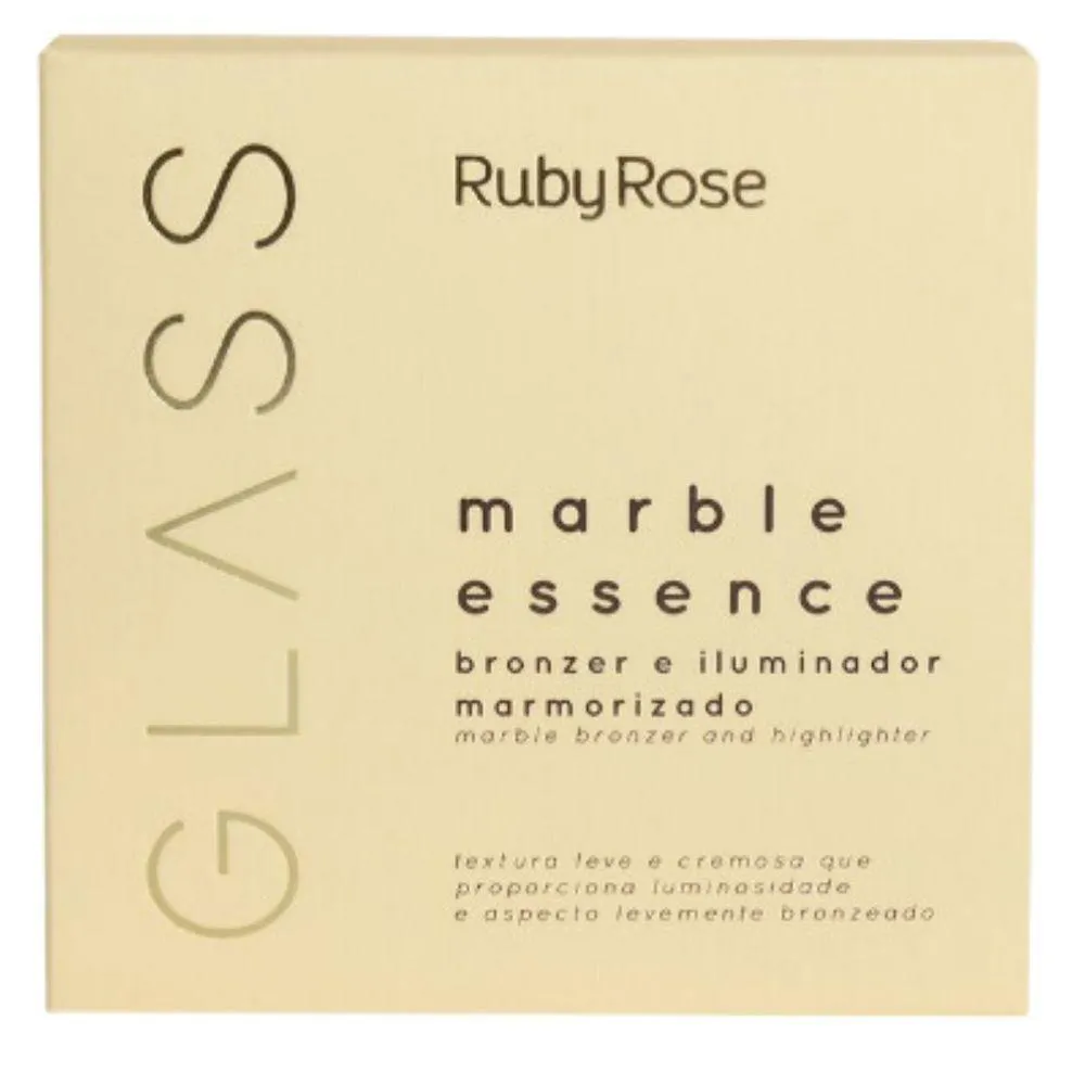 Marble Essence da linha Glass de Ruby Rose, um produto multifuncional que combina bronzer e iluminador em uma marmorizada única. Oferece um acabamento sofisticado, proporcionando um efeito de contorno e iluminação perfeitamente integrado.