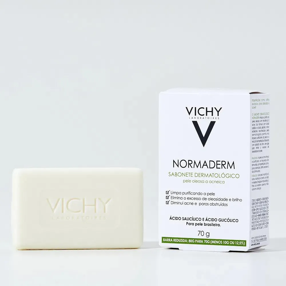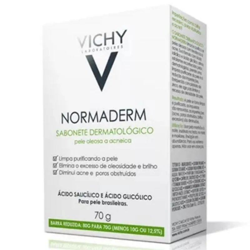 O Sabonete Dermatológico em Barra Vichy Normaderm pele oleosa a Acneica 70g foi desenvolvido para pele brasileira: possui em sua fórmula Ácido Salicílico e Ácido Glicólico, ativos esfoliantes reconhecidos pelos dermatologistas que permitem uma limpeza purificante da pele e a redução das imperfeições.