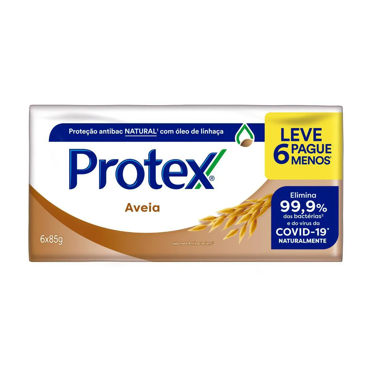 O produto é um sabonete antibacteriano em barra com aveia, composto por 6 unidades de 85g cada. Serve para higienização corporal, eliminando 99,9% das bactérias e do vírus da COVID-19, oferecendo proteção antibacteriana natural e cuidado com a pele, com propriedades suavizantes da aveia que ajudam a limpar e hidratar a pele durante o banho.