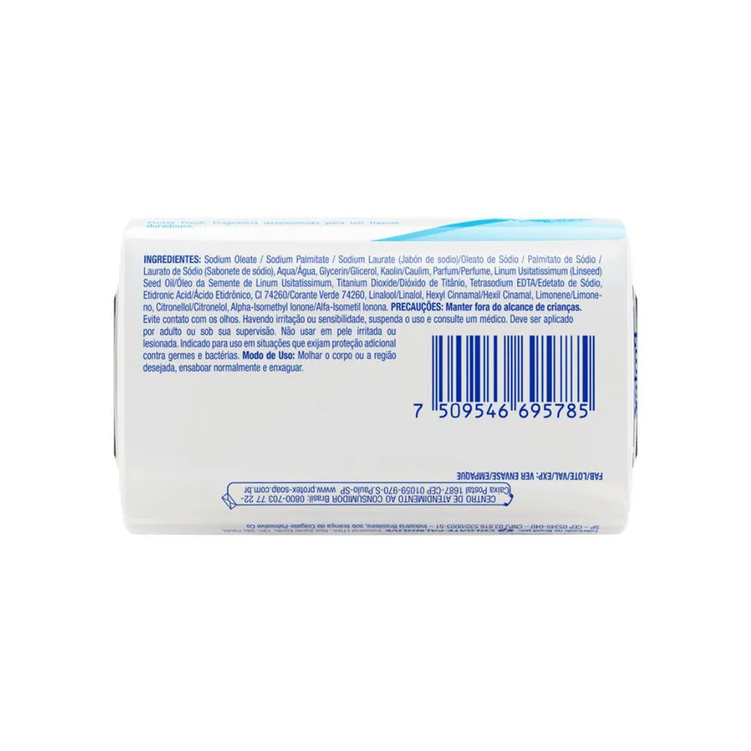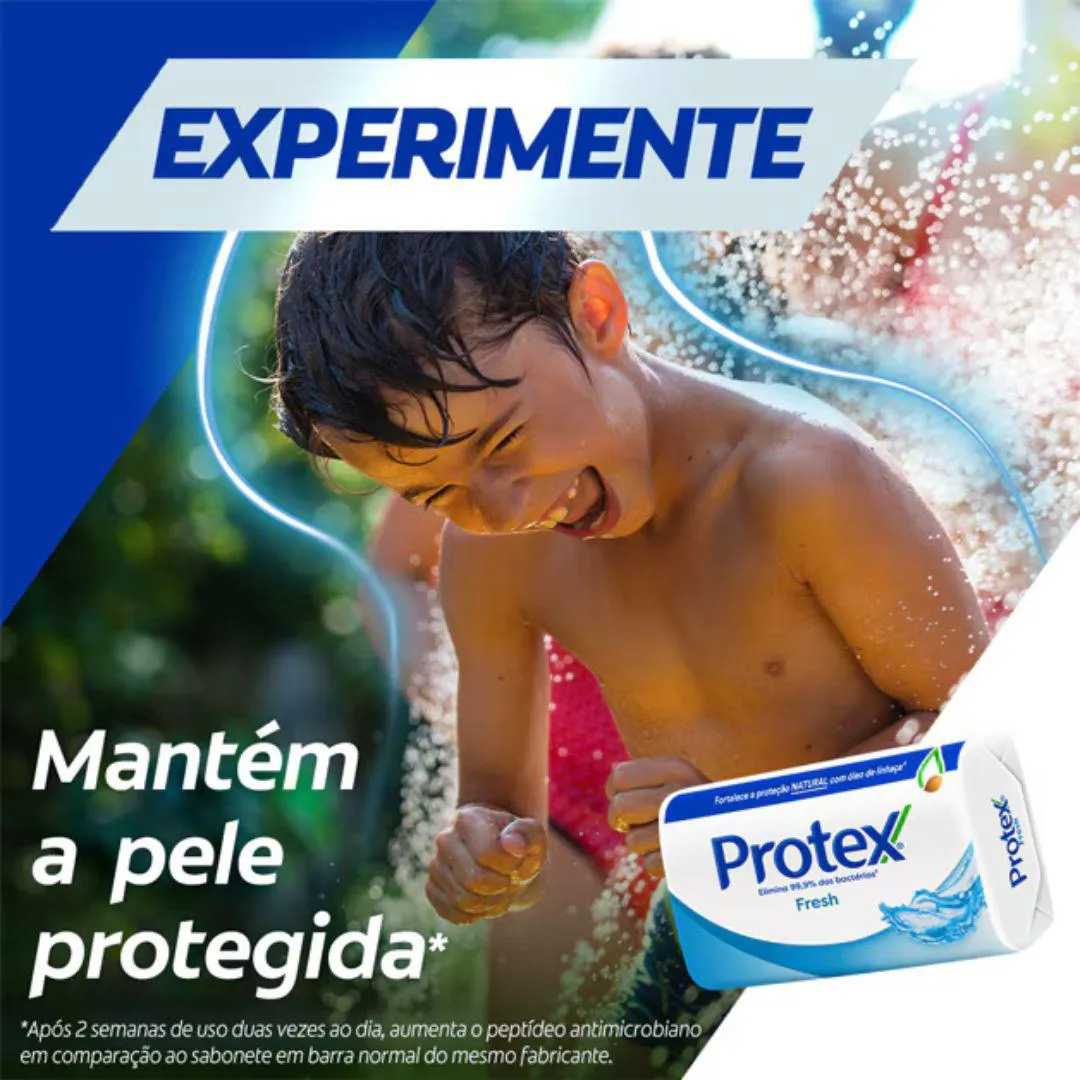 Sabonete em Barra Protex Fresh 85G O sabonete em barra Protex Fresh cuida da pele do corpo, oferecendo proteção antibacteriana natural com óleo de linhaça e eliminando 99,9% das bactérias. Além disso, ele cria uma barreira de proteção que ajuda a prevenir a proliferação de bactérias, mantendo você protegido por até 12 horas. Sua fragrância foi desenvolvida para um frescor duradouro. Benefícios e diferenciais: - Elimina até 99,9% das bactérias - Fórmula com Óleo de Linhaça. Proporciona hidratação e proteção contra bactérias. - Indicado para todos os tipos de pele. - Poder ser usado em todo o corpo. - Não contém parabenos. Como usar o Sabonete em barra Protex Fresh? - Aplique nas mãos, corpo ou região desejada até criar uma pequena espuma. - Enxágue em seguida. Advertências: - Uso externo. - Não ingerir. Caso haja contato com os olhos, lave-os abundantemente. Se houver irritação, suspenda o uso imediatamente e procure orientação médica. Conserve em local seco, fresco e ao abrigo de luz intensa. Mantenha fora do alcance das crianças. Marca: Protex Linha: Fresh Tipo: Sabonete em barra Peso unitário: 85g Ação: Elimina até 99,9% das bactérias Composição especial: Óleo de linhaça Indicação: Todos os tipos de pele Uso: Corpo todo Proteção: Até 12 horas