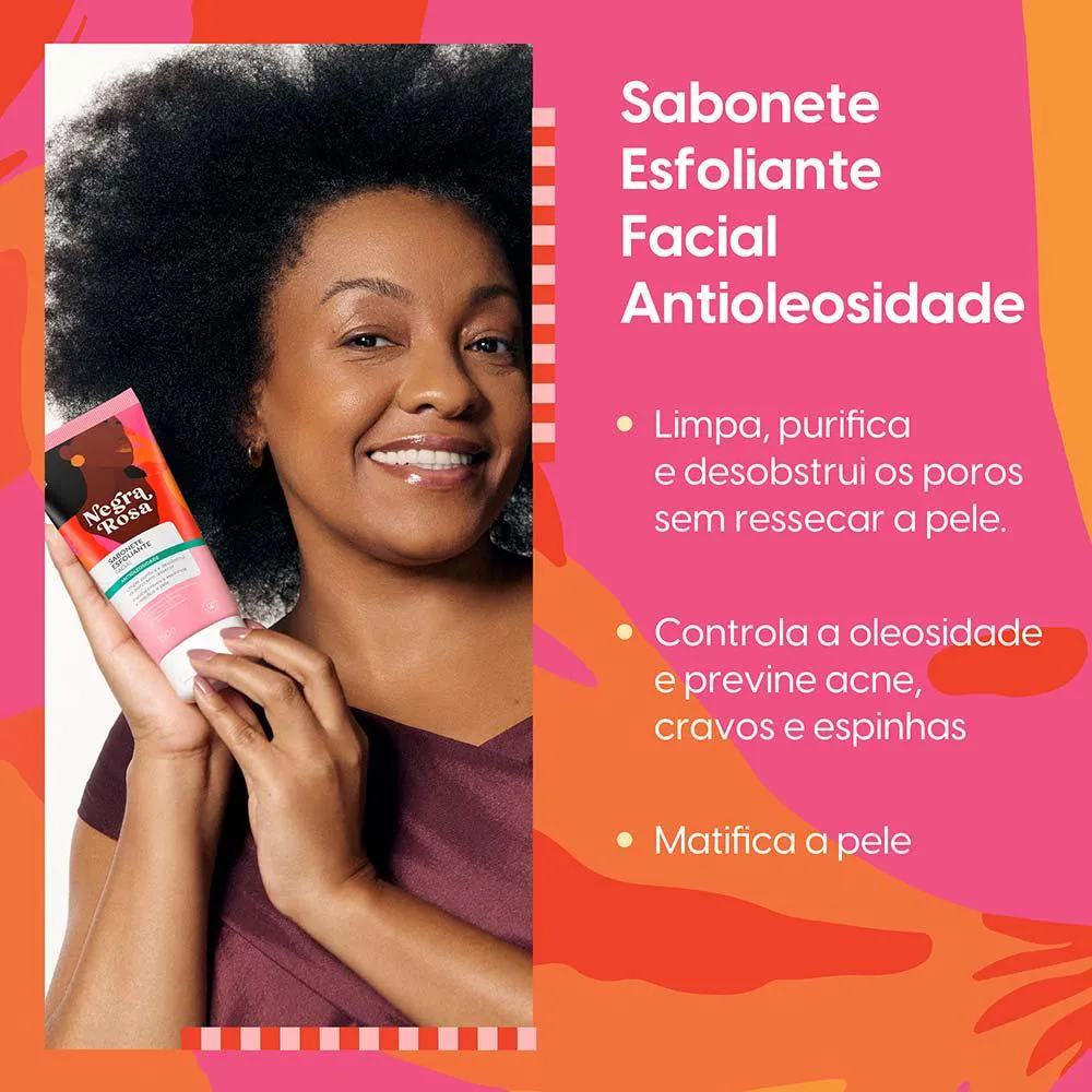 O Sabonete Esfoliante Facial Negra Rosa promove uma limpeza profunda da pele sem ressecar.