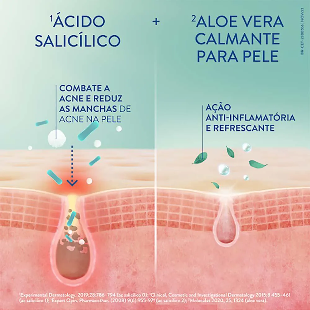 Ácido Salicílico, que combate a acne e reduz as manchas de acne na pele e diminui a produção de sebo Aloe Vera, agente calmante, com ação anti inflamatória e refrescante Chá Branco: confere ação antioxidante ajudando a proteger a pele. Aloe Vera: acalma a pele e proporciona uma ação refrescante.