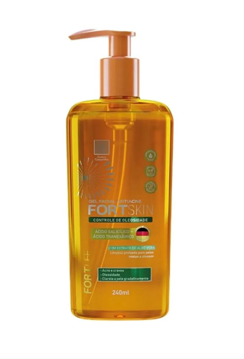- O FortSkin Sabonete Gel Facial Anti Oleosidade é um produto de limpeza facial desenvolvido para peles oleosas e acneicas. - Sua fórmula combina ingredientes poderosos que atuam em sinergia para proporcionar uma pele mais limpa, uniforme e saudável. - Composição: - Ácido salicílico: um beta-hidroxiácido (BHA) que penetra nos poros, removendo o excesso de oleosidade e células mortas, prevenindo a formação acne. - Ácido um ingrediente com propriedades clareadoras que ajuda a reduzir manchas escuras e uniformizar o tom da pele, promovendo um aspecto mais radiante. - Extrato de aloe vera: um ingrediente natural com propriedades hidratantes e calmantes que ajuda a suavizar a pele, prevenindo o ressecamento e a irritação. - Benefícios: - Ajuda a reduzir a oleosidade. - Controle de acne e cravos. - Clareia a pele gradtivamente.