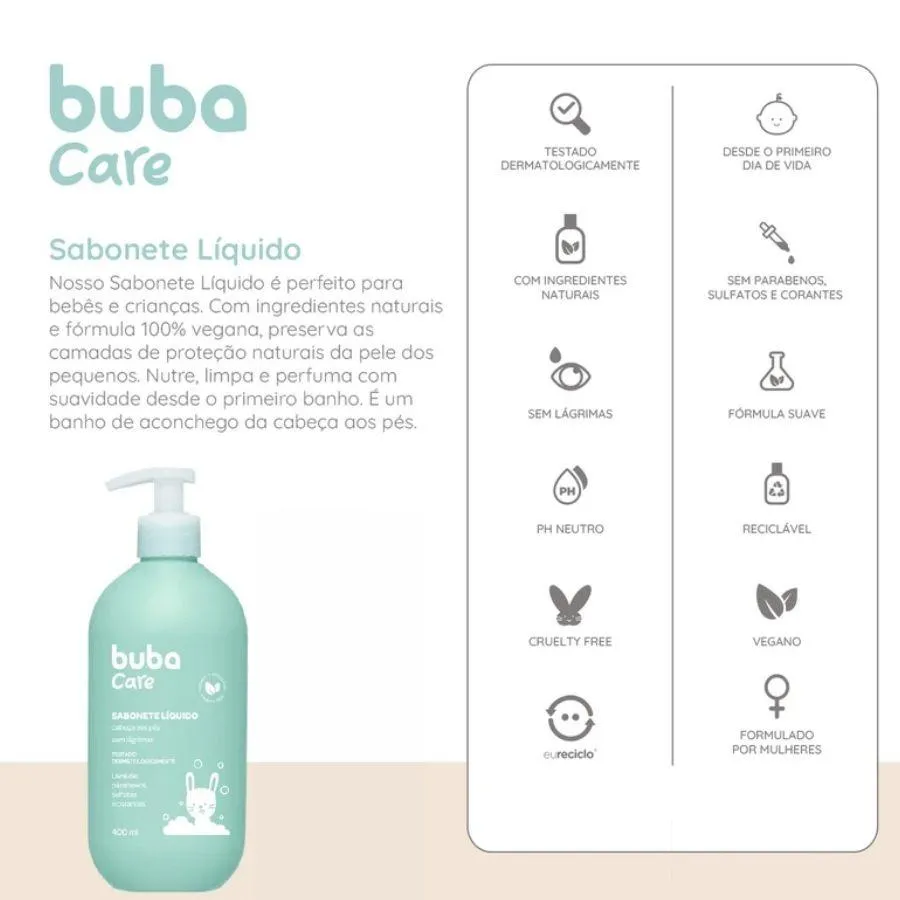 Buba Care Sem Lágrimas -Sabonete Líquido 400ml Sabonete líquido. Buba Care Sem Lágrimas proporciona um banho suave, seguro e sem lágrimas para bebês e crianças, limpando e protegendo a pele delicada dos pequenos. O Sabonete Líquido Buba Care Sem Lágrimas possui fórmula 100% vegana, desenvolvida com ingredientes naturais que limpam eficazmente sem agredir a pele do bebê. Sua fórmula livre de lágrimas garante um banho tranquilo e confortável, enquanto sua textura leve e cremosa proporciona uma experiência suave e agradável. Ideal desde o primeiro banho, o Sabonete Líquido Buba Care Sem Lágrimas nutre e perfuma a pele delicada do bebê, tornando o momento do banho um ritual de carinho e cuidado.