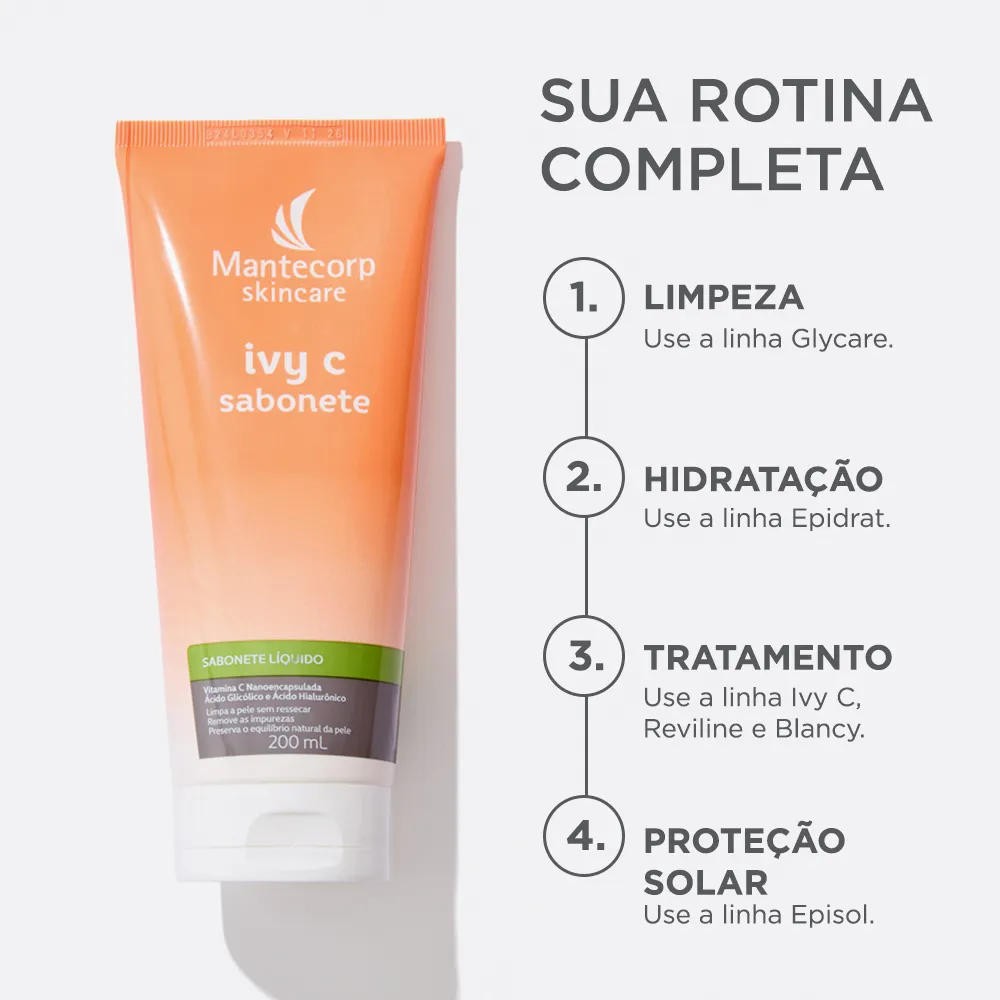 O Sabonete Líquido Facial Ivy C é um produto feito à base de vitamina c indicado para a limpeza diária do rosto, independentemente do tipo de pele. Este produto atua removendo as células mortas da superfície da pele e mantendo a sua hidratação natural por 2 horas. A sua formulação contém vitamina C Nanoencapsulada, Ácido Glicólico, Ácido Hialurônico e Aloe Vera que, juntos, preservam o equilíbrio natural da pele. Além disso, possui ação antipoluição e limpa a pele sem ressecá-la.
