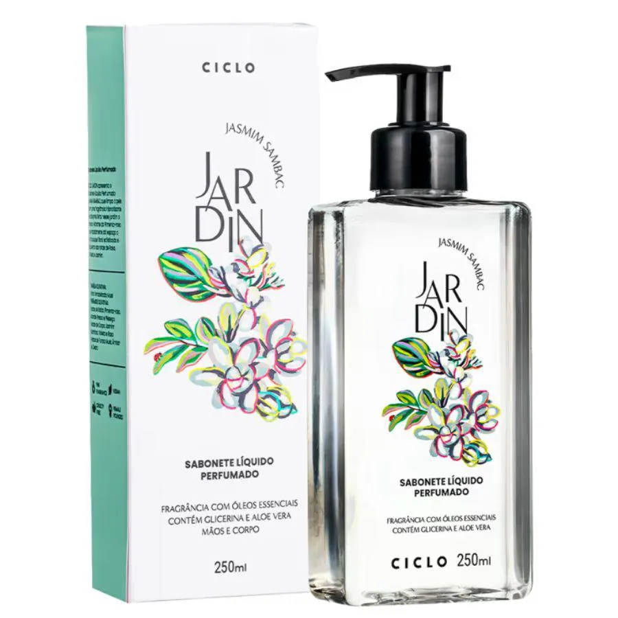 Sabonete líquido perfumado. Ciclo Cosméticos Jardin Jasmim Sambac higieniza a pele, enquanto exala delicioso aroma floral amadeirado. O Sabonete Líquido Ciclo Cosméticos Jardin Jasmim Sambac oferece uma experiência de limpeza suave e refinada para a sua pele. Desenvolvido com ingredientes de origem natural, como Glicerina e Aloe Vera, este sabonete líquido perfumado proporciona uma limpeza profunda, deixando a pele suave e perfumada com uma fragrância sofisticada e elegante de Jasmim Sambac. Produto vegano e cruelty free.
