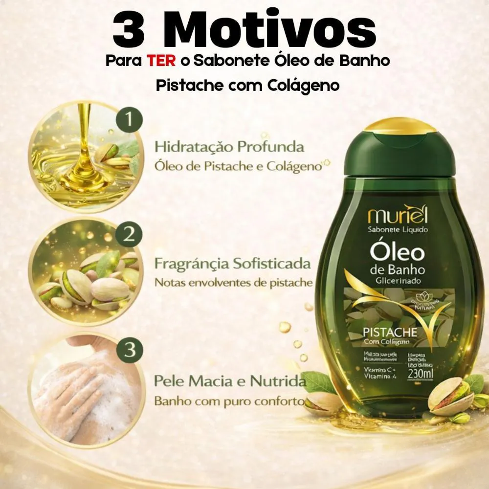 Transforme seu banho em um ritual de beleza e bem-estar com o Sabonete Líquido Muriel Óleo De Banho Glicerinado Pistache Com Colágeno 230ml. Este sabonete líquido foi cuidadosamente desenvolvido para proporcionar uma limpeza suave, aliada a uma hidratação profunda, deixando sua pele nutrida, macia e com um toque aveludado após cada uso. Ideal para quem busca um banho relaxante e uma pele visivelmente mais saudável.Sua fórmula exclusiva combina o poder do óleo de pistache, conhecido por suas propriedades nutritivas e antioxidantes, com o colágeno, um ingrediente essencial para manter a firmeza e elasticidade da pele. Desfrute de uma experiência sensorial única, com uma fragrância sofisticada e duradoura de pistache que transforma seu banho em um momento de puro prazer. Perfeito para todos os tipos de pele, especialmente as mais secas e sensíveis.Benefícios Principais: