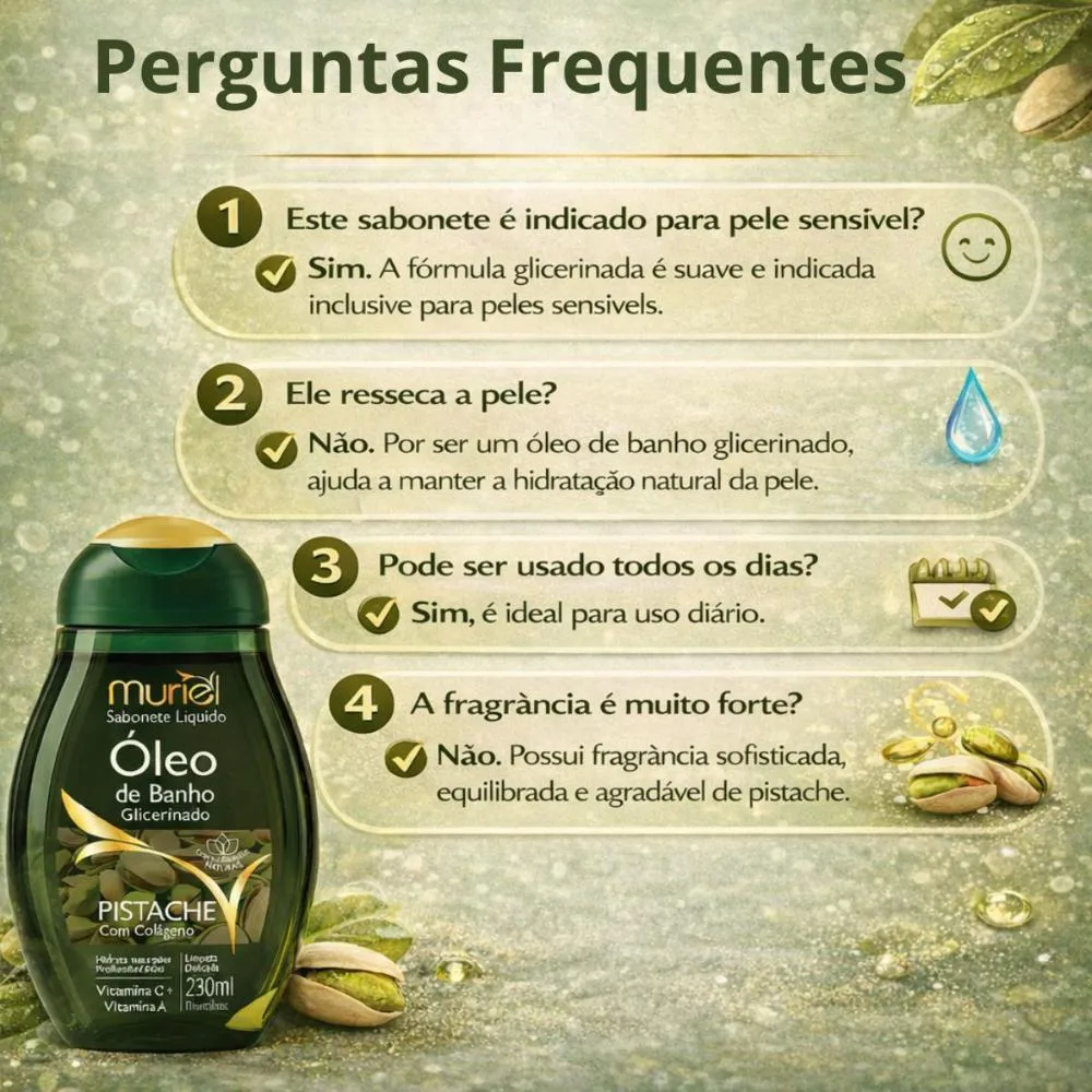 - Fragrância exclusiva de pistache, que transforma o seu banho em uma experiência sensorial única e relaxante.
