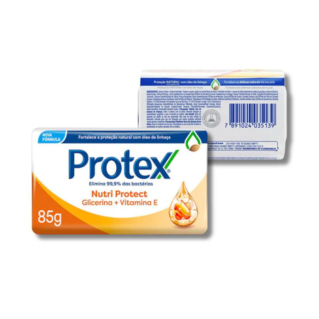 Sabonete Protex Nutri Protect Glicerina + vitamina e 85g O Sabonete em Barra Protex Nutri Protect Glicerina + vitamina E garante proteção antibacteriana de até 12 horas, eliminando 99,9% das bactérias. Sua fórmula exclusiva com óleo de linhaça fortalece a barreira natural da pele, enquanto a glicerina e a vitamina E proporcionam hidratação, suavidade e revitalização. Você terá cuidado, nutrição e proteção prolongada todos os dias. Marca: Protex Linha: Nutri Protect Tipo: Sabonete em barra Peso unitário: 85g Ação: Elimina até 99,9% das bactérias Proteção: Até 12 horas Fórmula: Com glicerina, vitamina E e óleo de linhaça Indicação: corpo pH: Balanceado Dermatologicamente testado: Sim Textura: Espuma cremosa