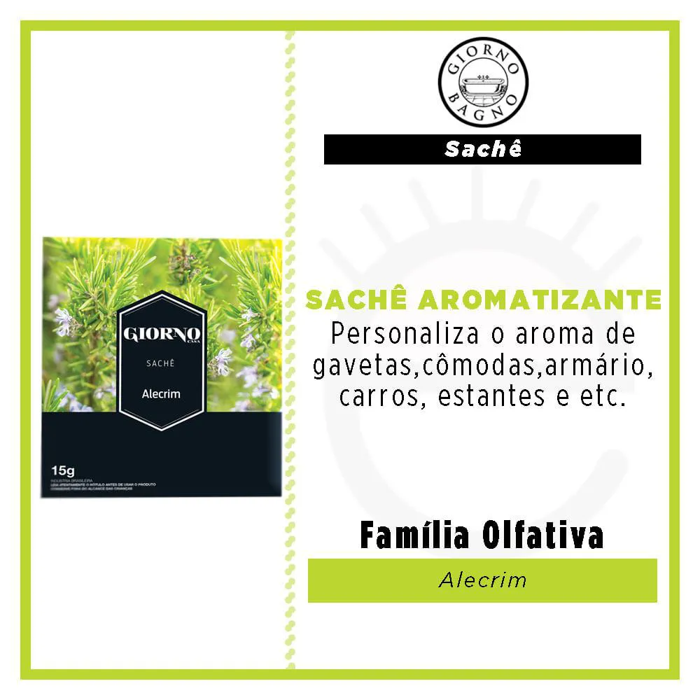 O Sachê Aromatizante Alecrim Giorno é desenvolvido com fragrâncias especiais e exclusivas que exalam um aroma suave e delicado. Produto versátil com vários aromas para perfumar pequenos ambientes e momentos especiais, com gestos de carinho, elegância e personalidade. Há diversas formas de usar o sachet.