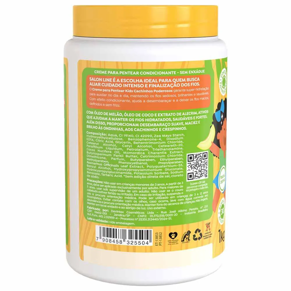 O Salon Line Kids Cachinhos Poderosos Melão Condicionador é um creme de pentear desenvolvido especialmente para cabelos cacheados, crespos e ondulados de crianças, formulado para cuidar e hidratar os cabelos infantis. Serve para hidratar, definir, fortalecer e controlar o frizz dos cachos, proporcionando maciez e saúde aos cabelos de crianças acima de 3 anos, com um delicado aroma de melão.