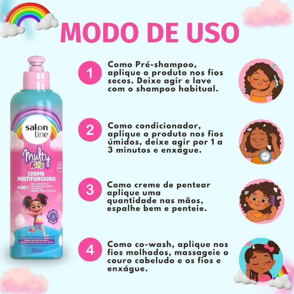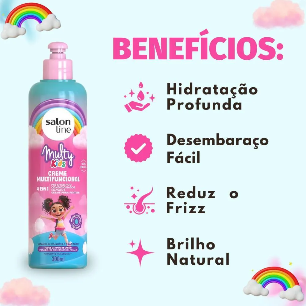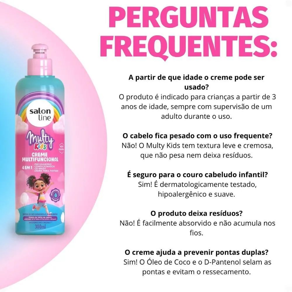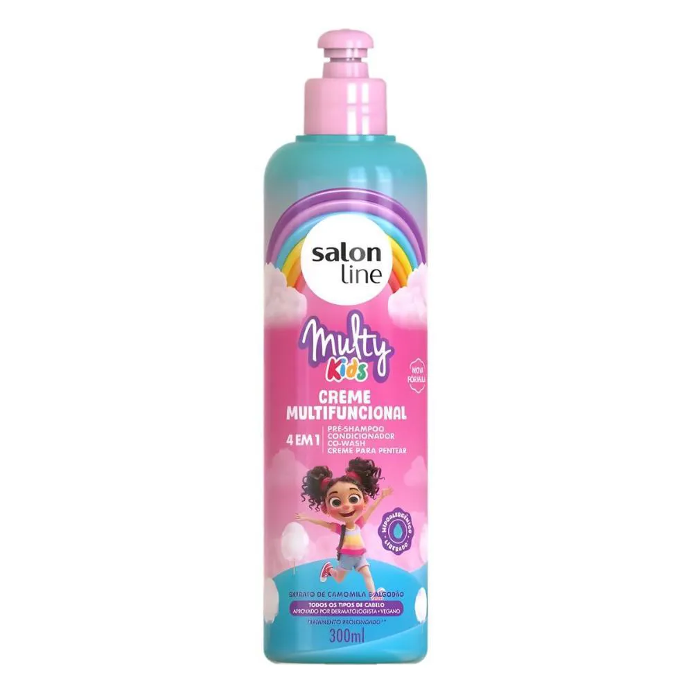 O Creme Multifuncional 4 em 1 Salon Line Multy Kids 300ml é o aliado perfeito para cuidar dos cabelos das crianças com praticidade e muito amor! Sua fórmula suave e dermatologicamente testada combina Camomila, D-Pantenol e Óleo de Coco, garantindo hidratação, brilho e maciez, além de facilitar o desembaraço dos fios. Versátil e leve, pode ser usado como pré-shampoo, condicionador, creme de pentear e co-wash, deixando os cabelos das crianças saudáveis, cheirosos e fáceis de cuidar todos os dias.Benefícios Principais