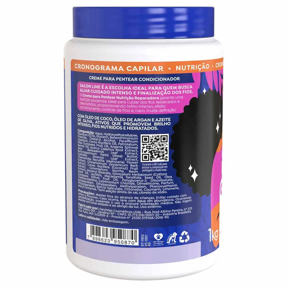 O Creme para Pentear Salon Line Nutrição Reparadora é um produto capilar desenvolvido especificamente para cabelos ondulados, cacheados, crespos e em transição capilar. Formulado com Óleo de Coco, Óleo de Argan e Azeite de Oliva Orgânico, o creme possui uma composição que nutre e cuida dos fios.