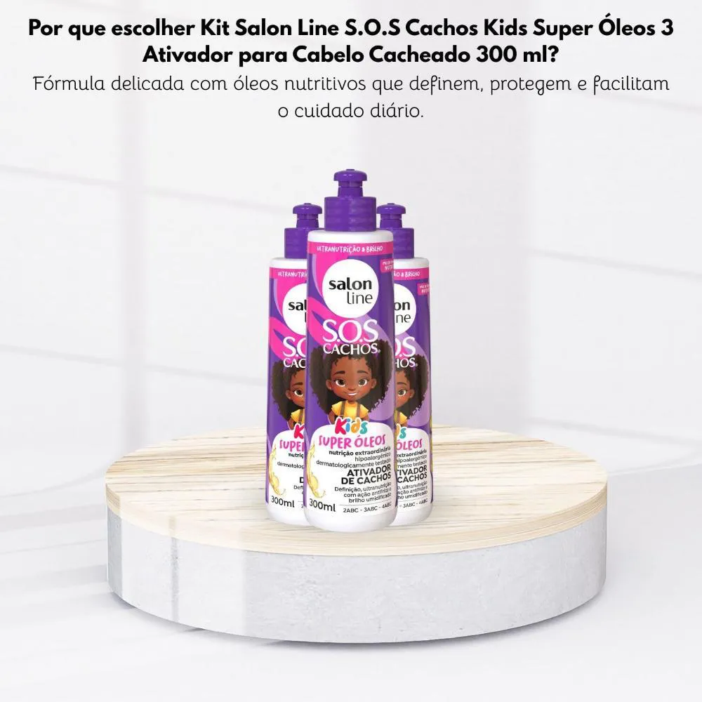 Kit Salon Line S.O.S Cachos Kids Super Oleos 3 Ativador para Cabelo Cacheado 300 ml é um cuidado para cabelos pensado para entregar desempenho na rotina, com foco no que a categoria promete (Kits para Cabelo).Para Qual tipo de cabelo é Indicado?
