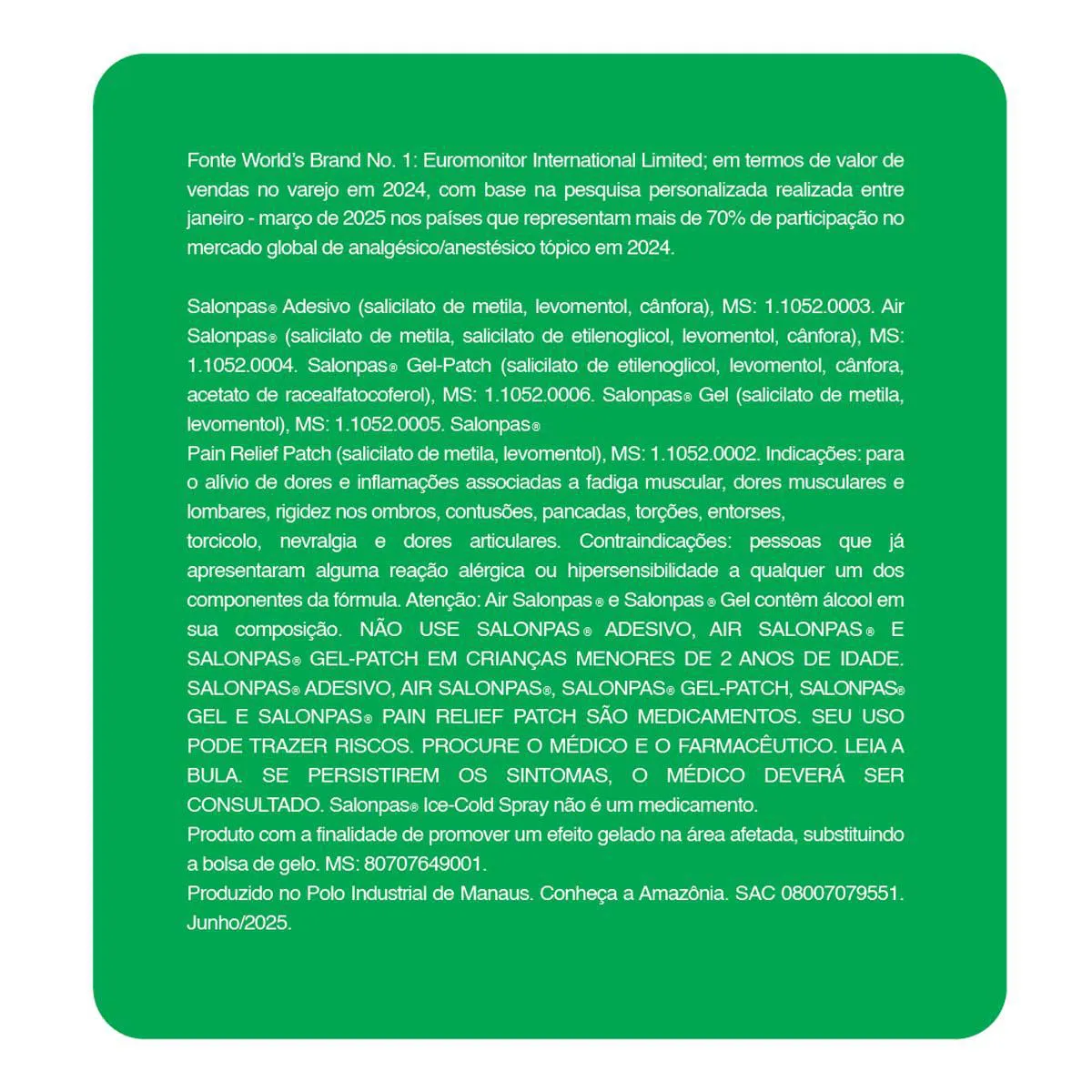 SALONPAS® Adesivo também pode ser utilizado para tratar outras condições determinadas por um médico.