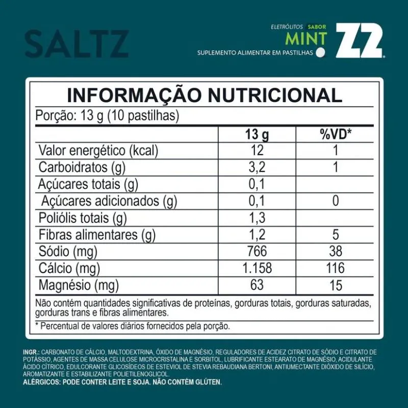 Saltz Pastilha (10 pastilhas) As pastilhas Saltz são as primeiras pastilhas de eletrólitos mastigáveis do brasil. Elas foram desenvolvidas visando a reposição de eletrólitos de forma rápida, personalizada e prática. Saltz auxilia na manutenção dos níveis de eletrólitos no corpo, que é essencial para prevenção da desidratação, retardo da sensação de fadiga e ocorrência de câimbras. *3º Colocado na Categoria Suplementos da Natural Tech Awards 2024. PERFORME NO SEU MÁXIMO Os sais minerais tem diversas funções no organismo, entre elas, equilibrar os fluidos no seu corpo, manter o pH do sangue adequado e conduzir sinais elétricos dos nervos para os músculos. A falta dos eletrólitos no nosso corpo, durante a atividade física, leva a queda do rendimento, fadiga muscular, mal estar e mais. Para evitar isso, e continuar performando no mais alto nível, Saltz é o que você precisa. JUST SALTZ Na nutrição esportiva, o simples funciona. Os sais mineiras são essenciais para o funcionamento do organismo. Para manter a máquina, que é o seu corpo, funcionando na máxima funcionalidade, você precisa estar hidratado. Nosso mix de hidratação Saltz, foi criado para repor exatamente o que você precisa. Nada mais. Só sais. BENEFÍCIOS: - Equilíbrio hídrico;- Reabastecimento de perdas pelo suor;- Impulso elétrico nervoso;- Regulação do ph sanguíneo;- Contração muscular;- Prevenção de cãibras e fadiga.
