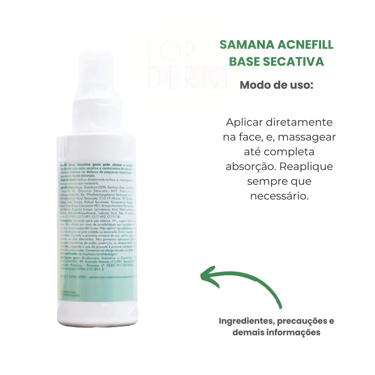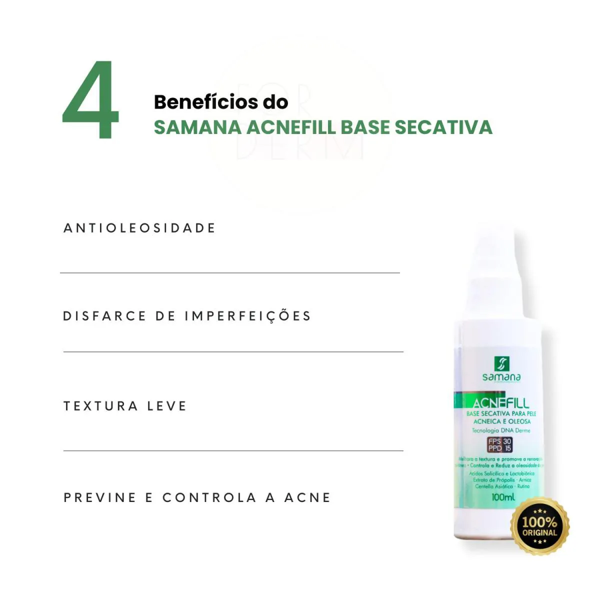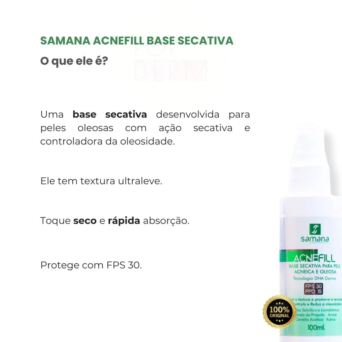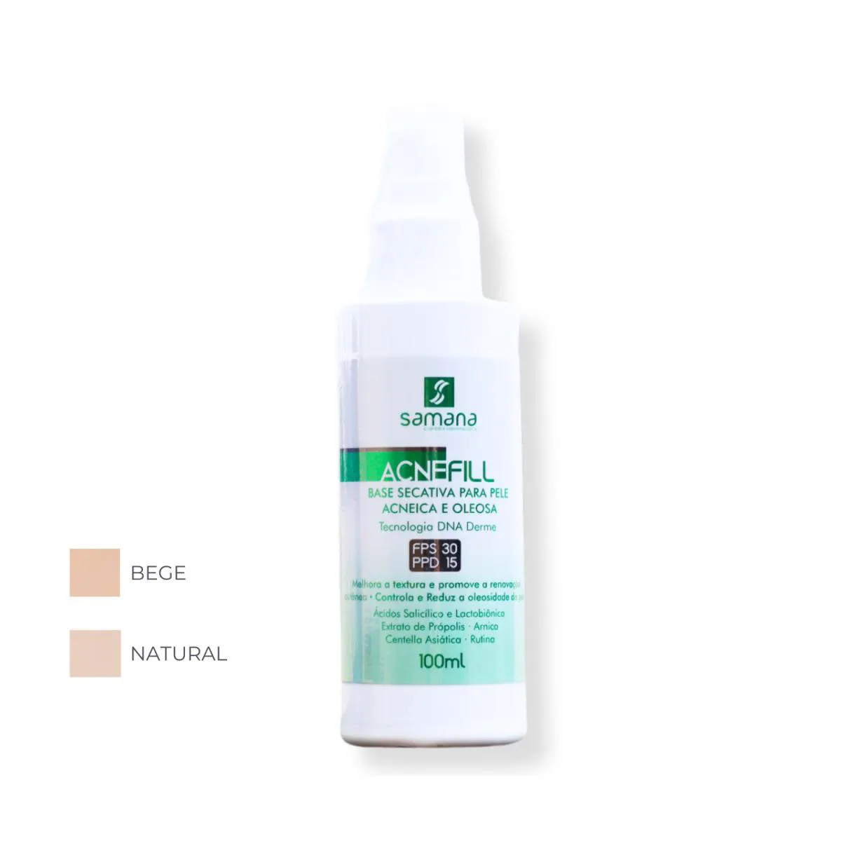 CARACTERÍSTICAS Acne Fill Base Secativa FPS 30 PPD 15 cor Natural da Samana é um fluído secativo para peles acneicas e com tendência a acne que controla a oleosidade, reduz poros e confere uniformização do tom, com a cobertura de pequenas imperfeições decorrentes da acne. Possui toque seco, rápida absorção e fácil adaptação a pele; além de proporcionar proteção ao DNA celular. Disponível nas cores Natural e Bege. PRINCIPAIS ATIVOS Rutina, Extrato de Própolis, Arnica e Centella Asiatica; Ácido Salicílico e Ácido Lactobiônico. MODO DE USO Após completa higienização da face, aplicar uniformemente antes da exposição solar e reaplicar a cada 3 horas. Agite antes de usar. Rentabilidade: 60 aplicações.